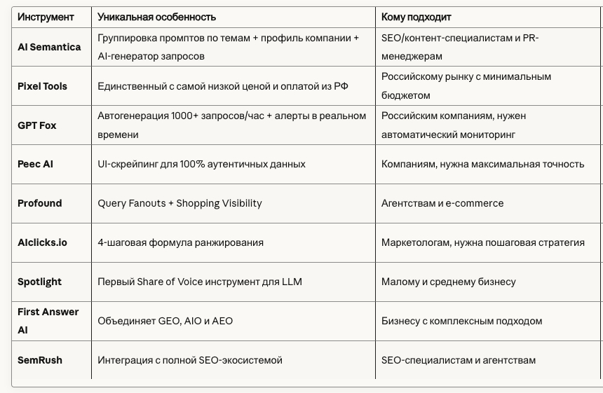Почему стоит попробовать: объединяет GEO, AIO, AEO в одном инструменте