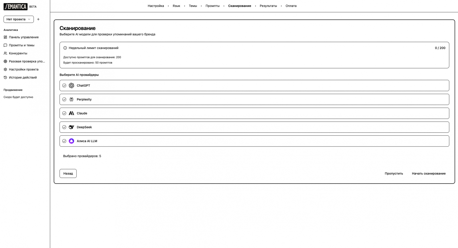 По каждой модели (ChatGPT, Claude, DeepSeek, Perplexity, Алиса AI LLM) можно включить или выключить сканирование индивидуально.