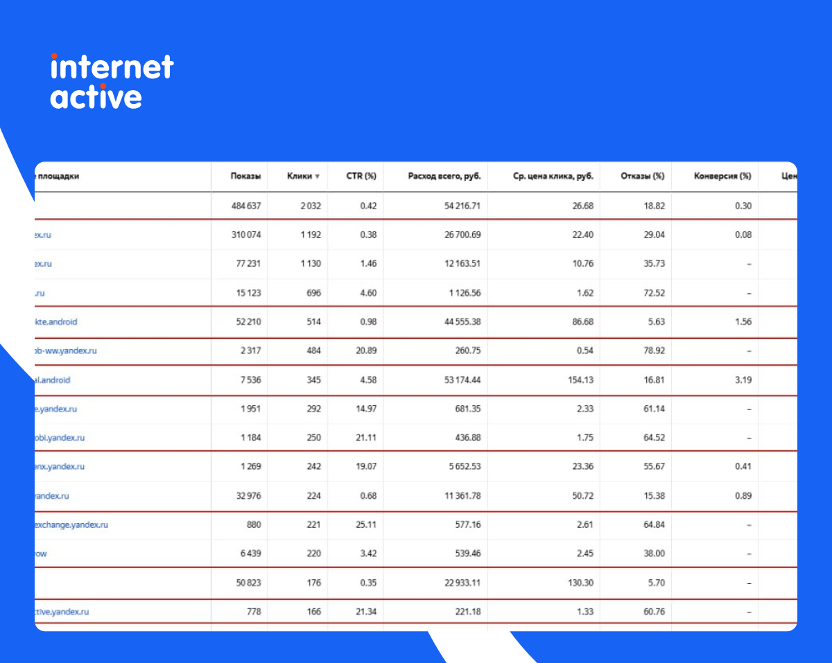 Анализируем статистику и отключаем площадки с высоким CTR, но без конверсий и высокими отказами — часто это нерелевантный трафик.