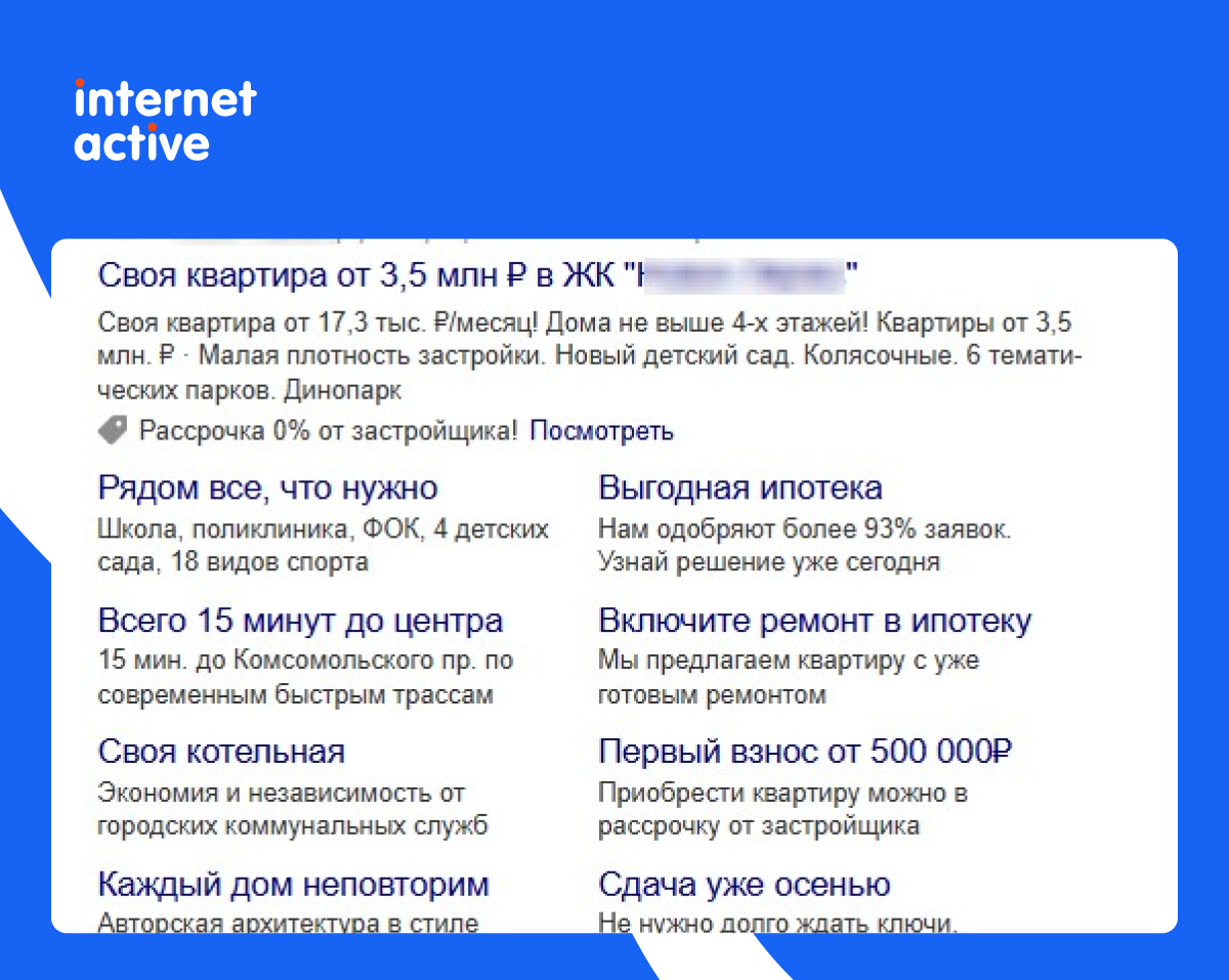 Включаем в объявления конкретные цифры: "Ипотека от 0,1%", "Рассрочка на 3 года", "Первоначальный взнос 10%".
