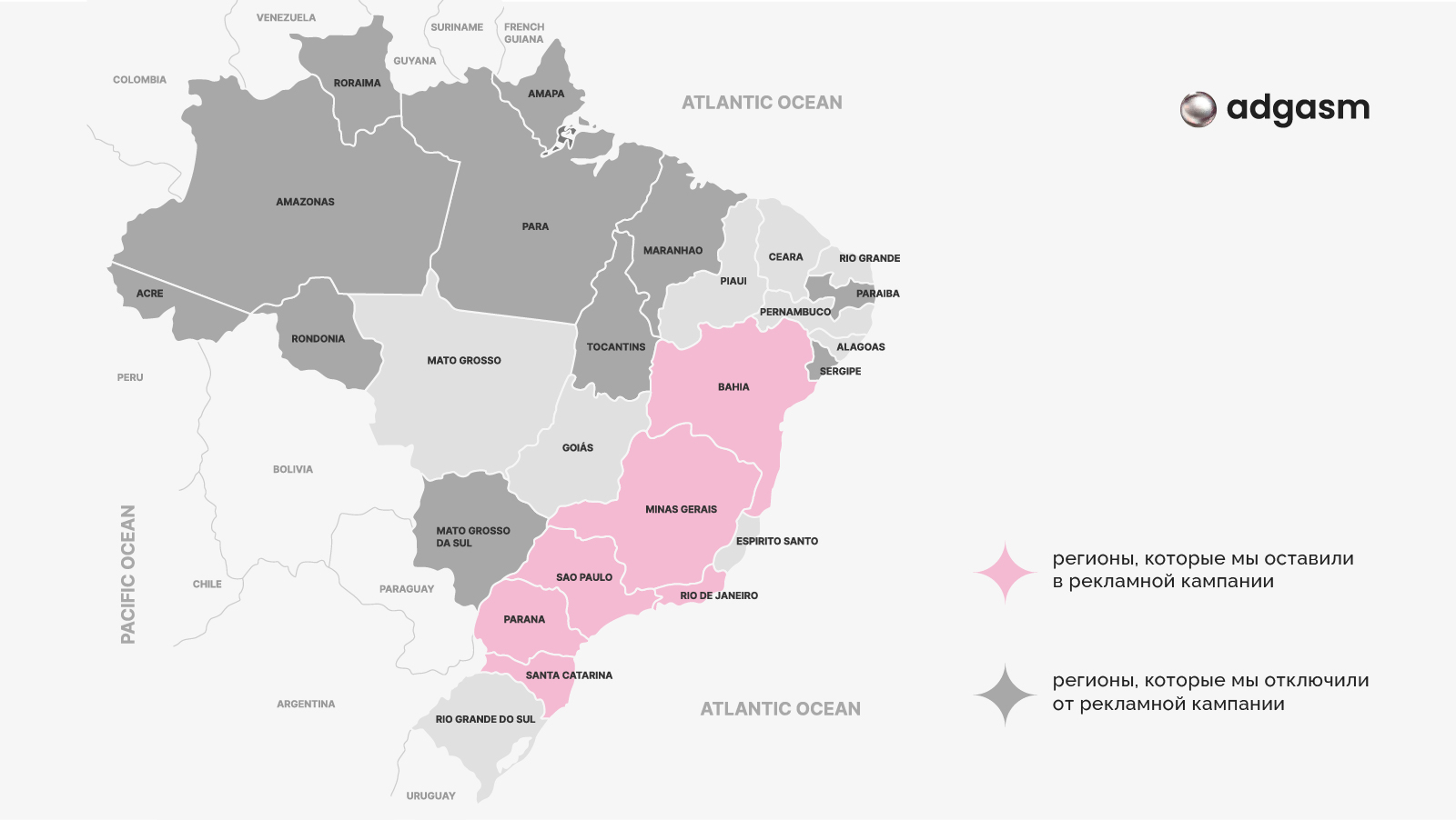 Ещё мы проанализировали номера телефонов реальных квалифицированных лидов и определили по коду их регионы, чтобы отсеять штаты с низкой конверсией в покупку. Ими оказались Пара, Мараньян, Амазонас, Сержипи, Параиба, Мату-Гросу, Рондония, Токантинс, Акри, Рорайма, Амапа. На эти штаты приходились 9% лидов, которые приносили всего 1% выручки. За счёт отключения мы перераспределили рекламный бюджет на целевые регионы.