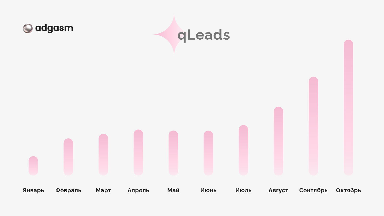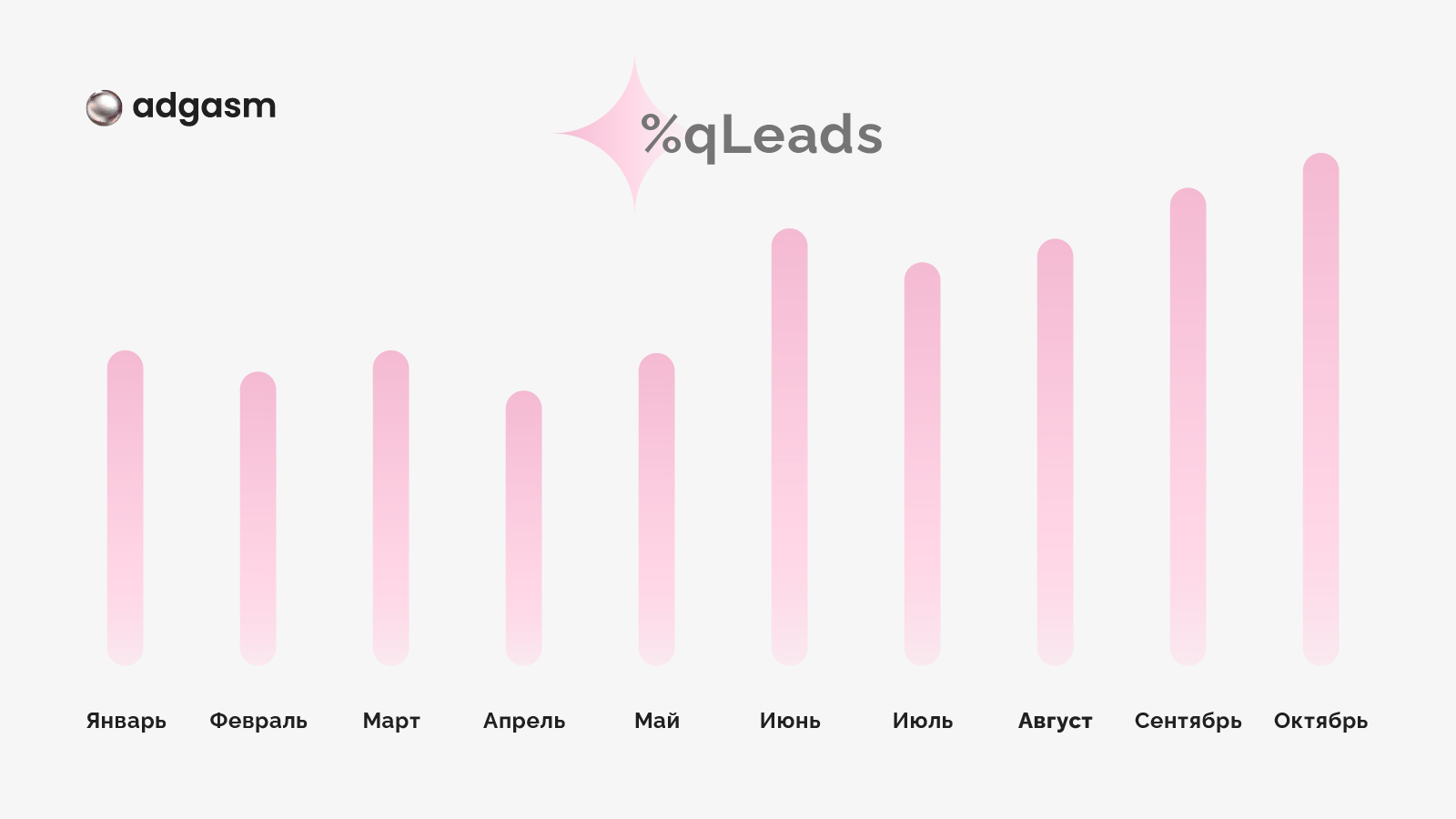 С конца июля мы начали получать хорошие результаты по квалифицированным лидам, в августе, потом и в сентябре пробили потолок, а в октябре буквально улетели в космос. Так, в июле процент квалифицированных лидов достиг 40,1%, в августе — 42,5%, в сентябре — 47,5%, а в октябре — 51%. При этом количество квалифицированных лидов в октябре было в два с половиной раза больше, чем в июле.