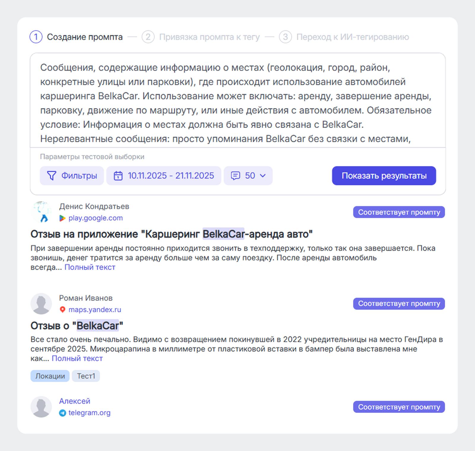 ИИ-тегирование — это тегирование по смыслу, а не по ключевым словам. Автоматическое тегирование на основе вашего промпта в разы сокращает время на обработку большого массива сообщений, освобождая время аналитиков для решения более сложных и приоритетных задач.