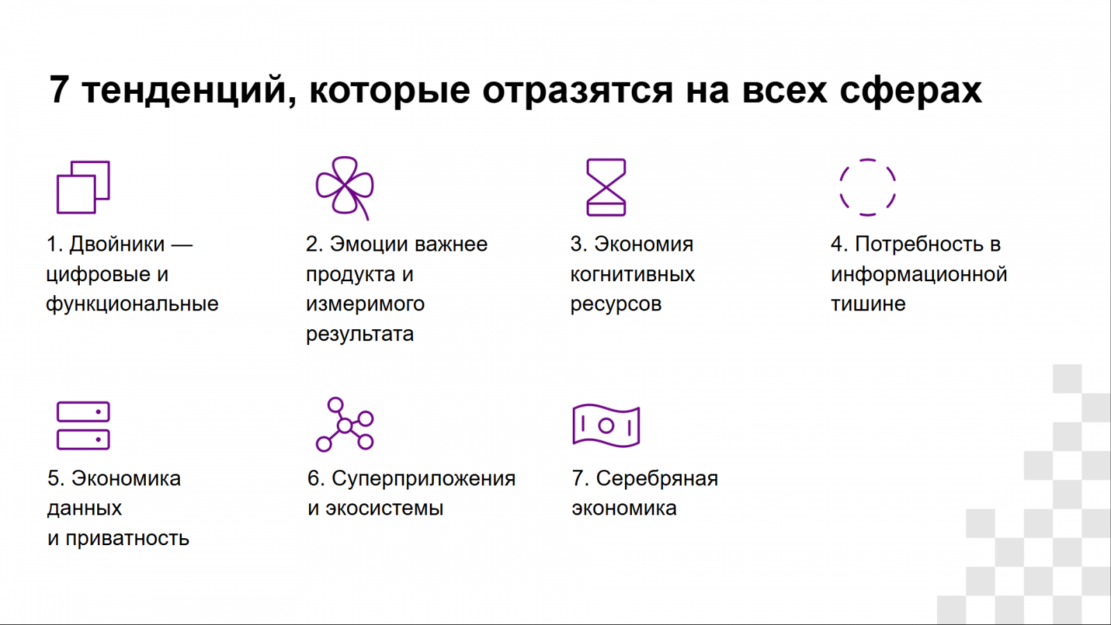 Тема презентации — «Бизнес после 2030: 7 векторов стратегического роста, которые нужно запускать уже сейчас». У нас была фактура от Ильи, его идеи и материалы. Но! Как редакторам, нам нужно было среди всех идей вычленить эти семь векторов (сверить их с Ильей), и «досыпать» больше примеров — как эти тренды проявляются в реальности.