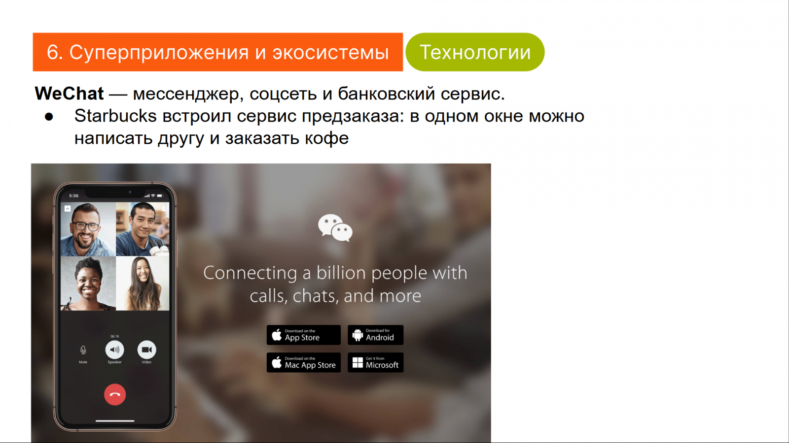 У меня бывает гиперфиксация на некоторых задачах, я начинаю переживать за них больше, чем за что-либо еще, происходящее сейчас в жизни. Пока я делала презентацию, начала замечать подходящие примеры везде вокруг. Например, смотрю рилс, а там упомянули, что кофе от Starbucks можно заказать прямо в WeChat — о, отличный пример суперприложения.