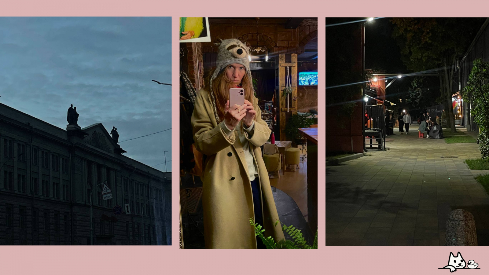 Я и забыла, что в Минске есть эти «внутренние» улицы с кафе — снаружи ты долго идешь вдоль какой-то заводской стены и не понимаешь, где все, но если в проеме свернуть на смех, внутри между улиц будут столы и фонарики.