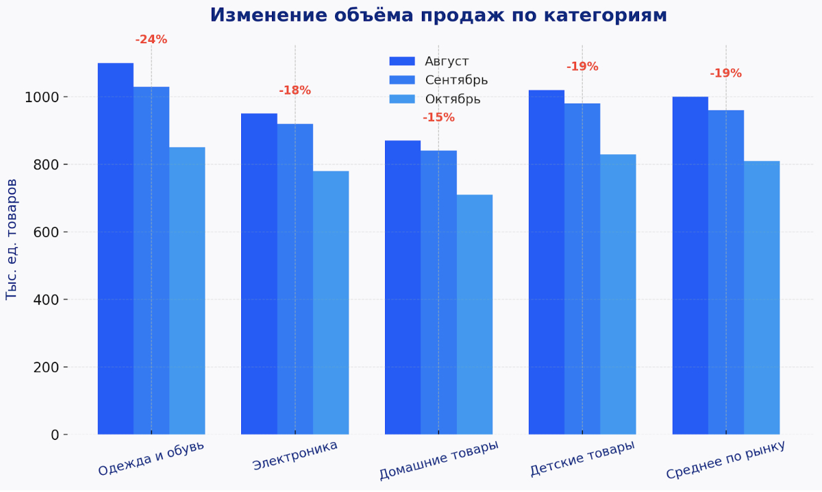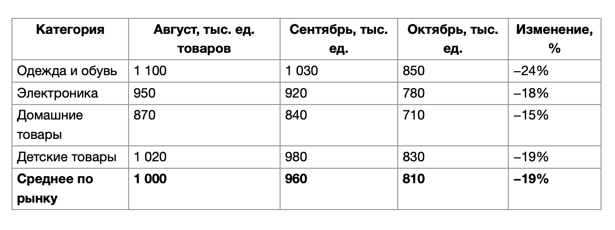 По данным Shopstat, снижение складских остатков отмечалось во всех ключевых категориях — от одежды до электроники.При этом аналитики уточняют: полные данные доступны только до 1 октября, так как Wildberries закрыл возможность выгрузки информации по товарным карточкам. Поэтому октябрьская статистика основана только на данных от Ozon.