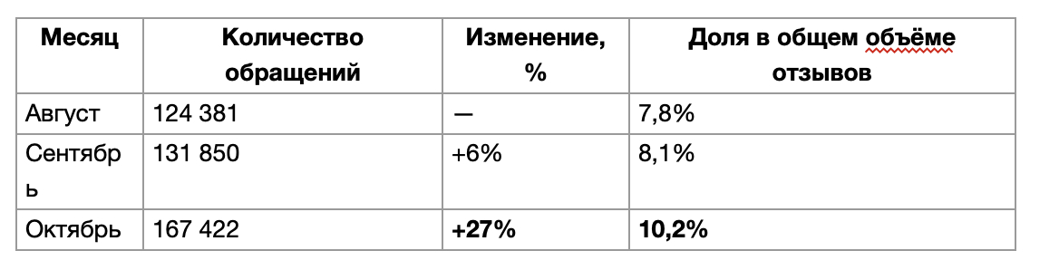 На фоне этого сервис анализа «Ответо» зафиксировал рост числа вопросов и негативных отзывов, связанных со сроками доставки товаров из-за рубежа — плюс 27% за месяц.