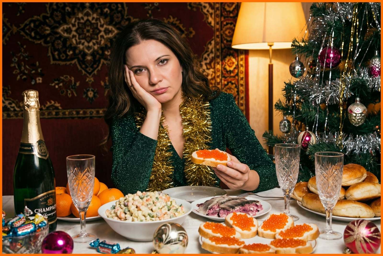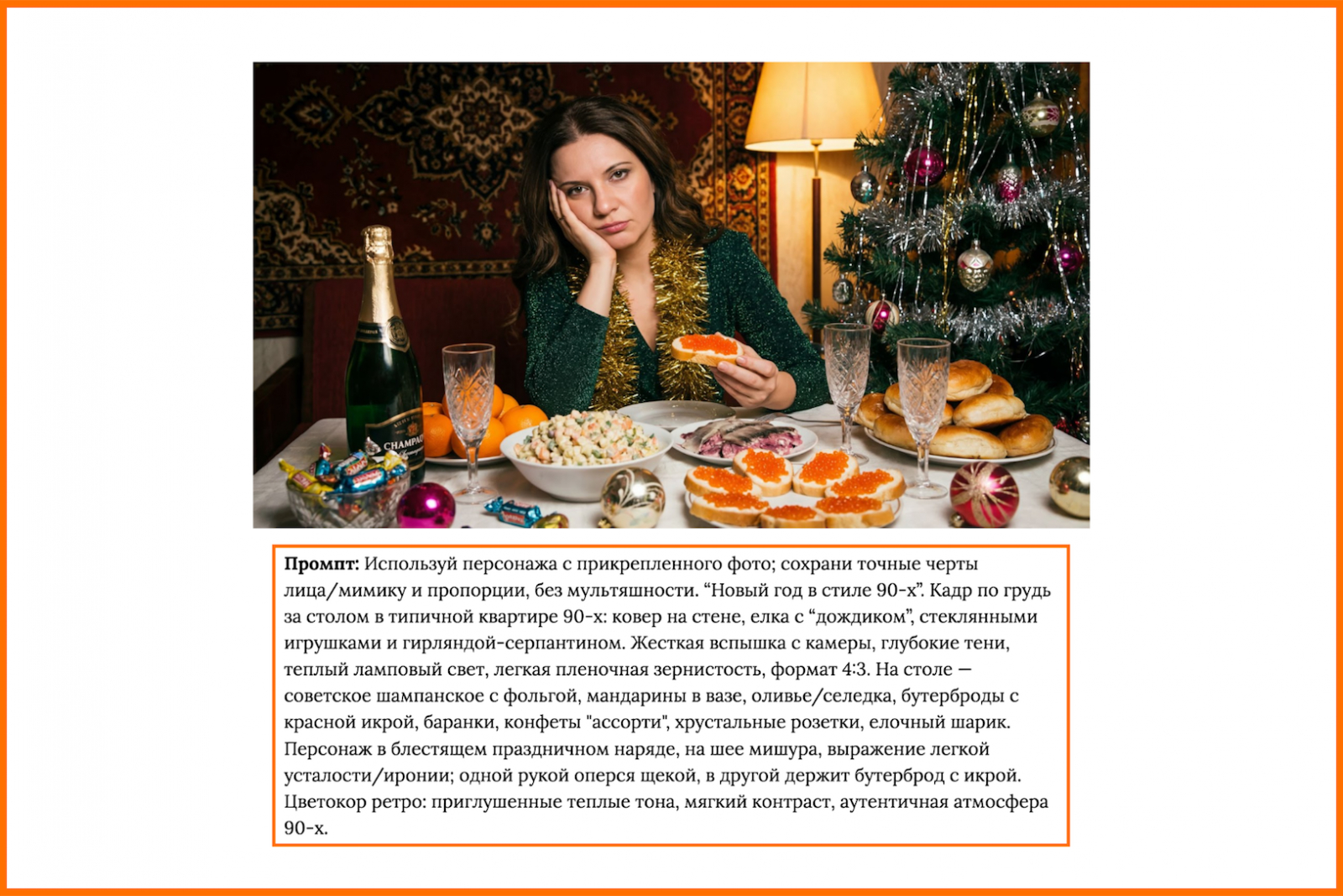 Промпт: Используй персонажа с прикрепленного фото; сохрани точные черты лица/мимику и пропорции, без мультяшности. “Новый год в стиле 90-х”. Кадр по грудь за столом в типичной квартире 90-х: ковер на стене, елка с “дождиком”, стеклянными игрушками и гирляндой-серпантином. Жесткая вспышка с камеры, глубокие тени, теплый ламповый свет, легкая пленочная зернистость, формат 4:3. На столе — советское шампанское с фольгой, мандарины в вазе, оливье/селедка, бутерброды с красной икрой, баранки, конфеты "ассорти", хрустальные розетки, елочный шарик. Персонаж в блестящем праздничном наряде, на шее мишура, выражение легкой усталости/иронии; одной рукой оперся щекой, в другой держит бутерброд с икрой. Цветокор ретро: приглушенные теплые тона, мягкий контраст, аутентичная атмосфера 90-х.