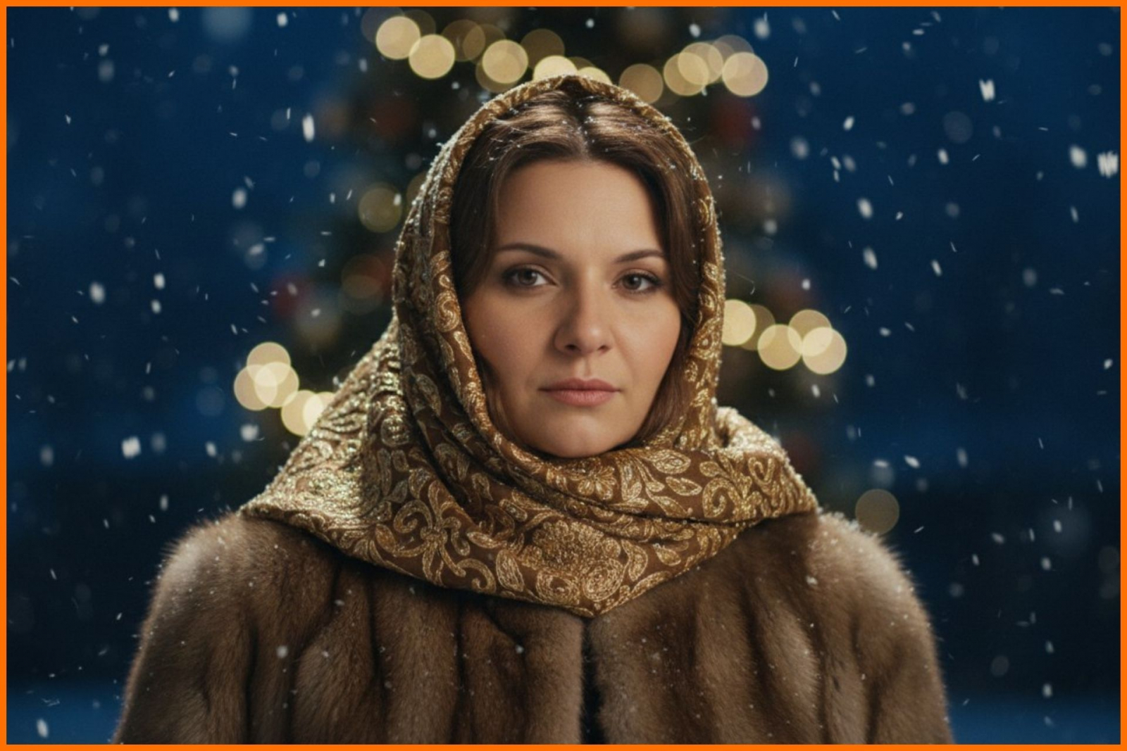 Промпт: Создай изображение женщины: кинематографичное изображение женщины с фото-референса в хиджабе с золотой вышивкой, средний план, в шубе коричневой пушистой дорогой с соболиным мехом. Одета в хиджаб поверх шубы, который расшит роскошными золотыми узорами и вышивкой. Смотрит в камеру, выражение лица спокойное, торжественное. Идет снег с эффектом боке. Фон темно-синий с размытыми огоньками. Мягкое освещение создает сияние на вышивке. Элегантная праздничная атмосфера. Крупный план. За спиной сияет на фоне вечернего неба елка новогодняя в гирляндах.