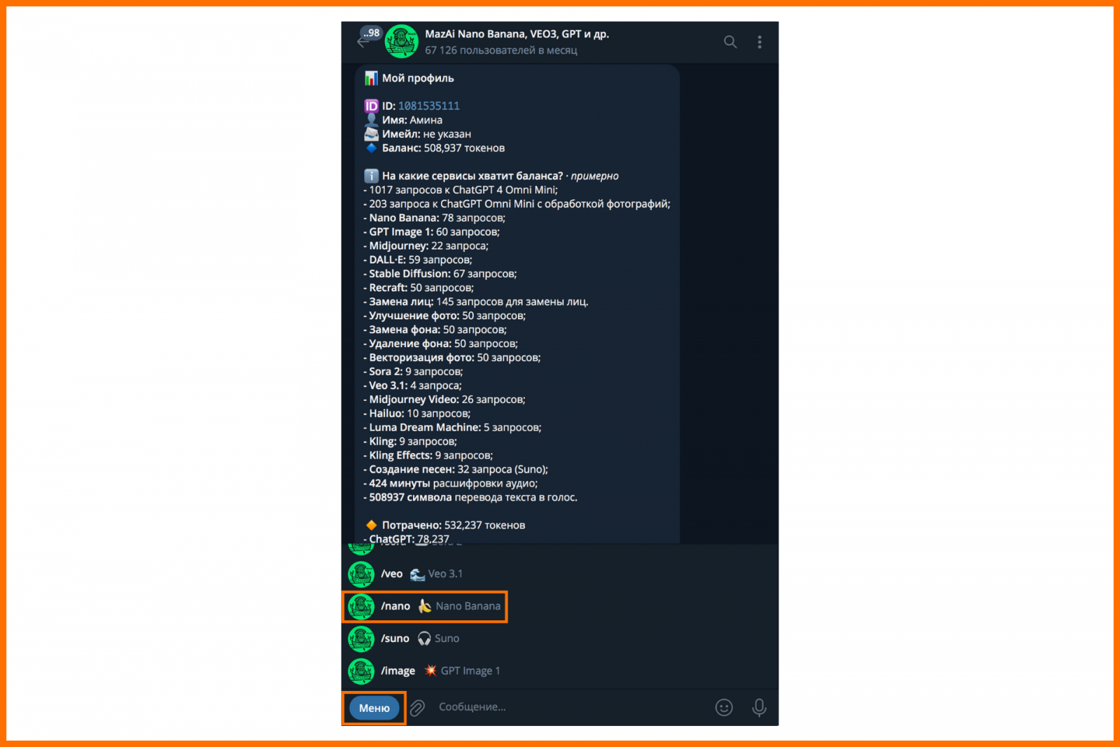 Шаг 3. Нажмите на кнопку “Меню” и в открывшемся списке отыщите Nano Banana — нейросеть со значком банана: