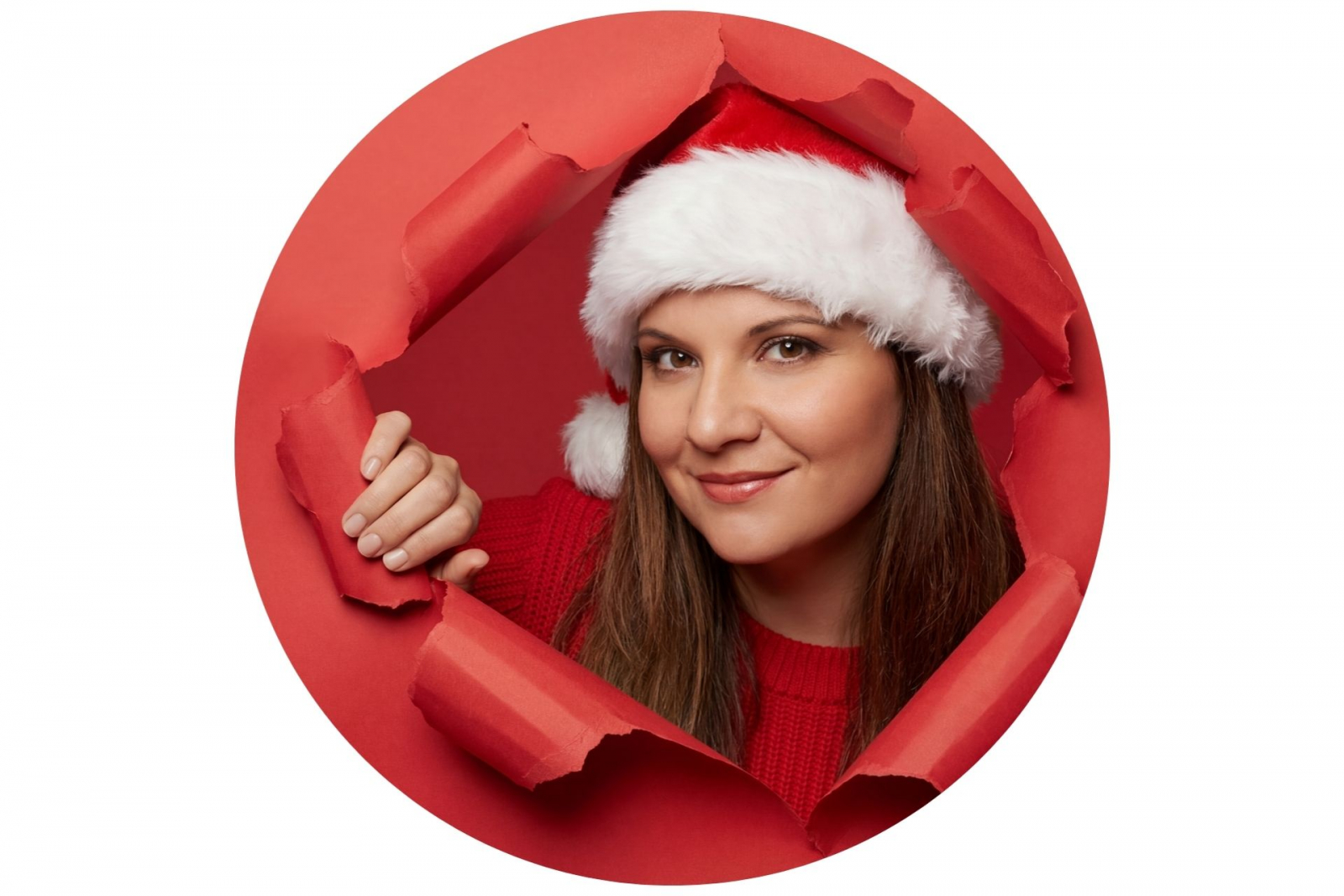 Промпт: Ультрареалистичный студийный портрет в смелой рождественской рекламной концепции. Человек, изображенный на референсном снимке, появляется из разорванной красной бумажной поверхности. Бумага разорвана в виде неправильного треугольника с реалистичными загнутыми краями и видимой текстурой бумаги. Человек осторожно держит разорванную бумагу одной рукой, частично оттягивая ее в сторону. Фон — чистый, однотонный красный студийный фон, идеально гладкий и равномерно освещенный, соответствующий цвету бумаги для создания цельного монохромного образа. Человек одет в красный вязаный свитер и классическую шапку Санты с белой меховой отделкой. Стиль праздничный, минималистичный и современный. Выражение лица теплое и дружелюбное, с уверенным, располагающим взглядом, направленным прямо в камеру. Мягкое студийное освещение с мягкими бликами на лице и краях бумаги, без резких теней. Оттенки кожи естественные, текстуры очень детализированные. Камера: портрет среднего плана, ракурс на уровне глаз, резкая фокусировка на лице, малая глубина резкости. Фотореализм: очень высокая, реалистичная текстура бумаги.