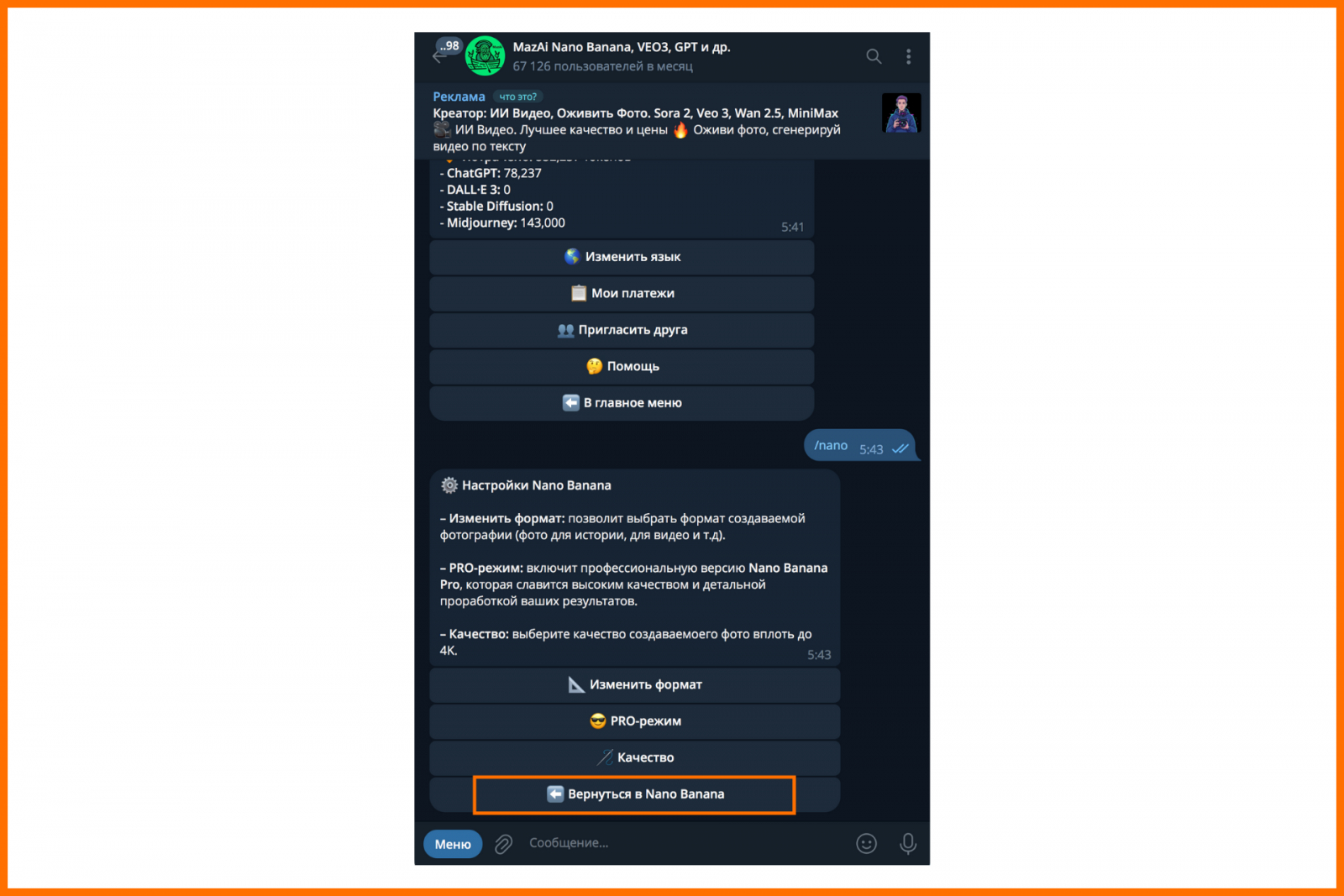 Шаг 9. Отправьте сообщение боту — он передаст запрос напрямую в официальный сервис Nano Banana и вернет готовый результат: