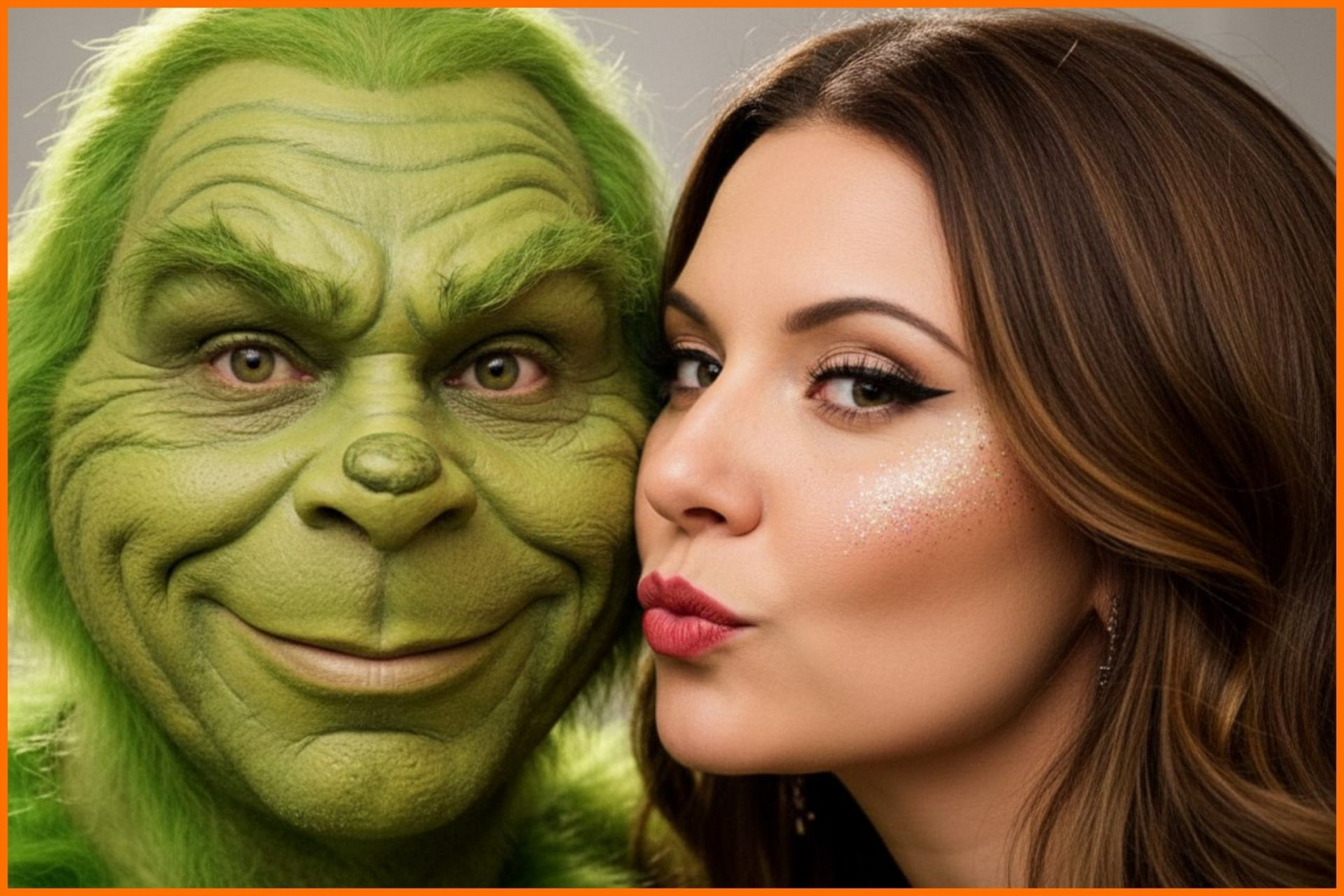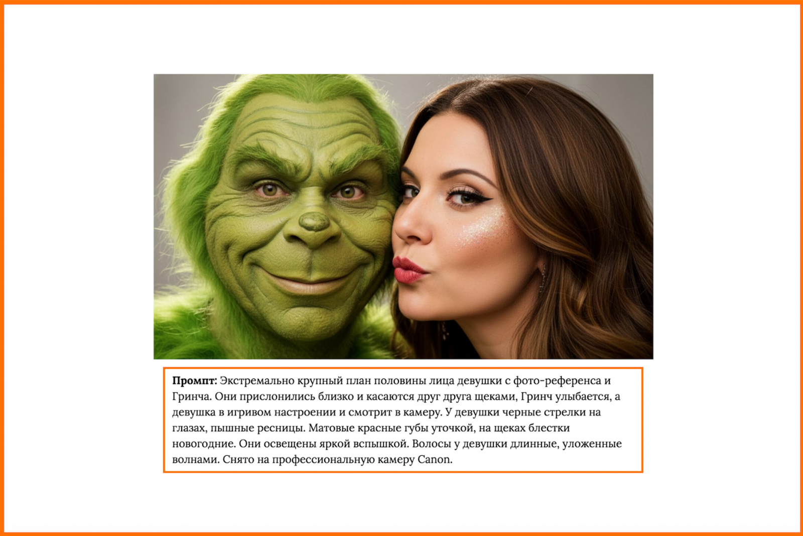 Промпт: Экстремально крупный план половины лица девушки с фото-референса и Гринча. Они прислонились близко и касаются друг друга щеками, Гринч улыбается, а девушка в игривом настроении и смотрит в камеру. У девушки черные стрелки на глазах, пышные ресницы. Матовые красные губы уточкой, на щеках блестки новогодние. Они освещены яркой вспышкой. Волосы у девушки длинные, уложенные волнами. Снято на профессиональную камеру Canon.