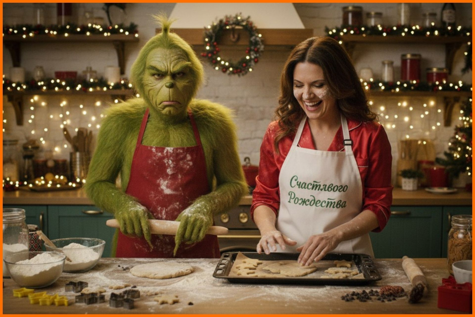 Промпт: Создай изображение женщины с фото-референса и Гринча: кинематографичное и максимально реалистичное изображение, где женщина на уютной кухне, украшенной к Новому году, стоит у кухонного островка и печет новогоднее печенье. Вся в муке. Одета в красную шелковую пижаму и белый однотонный фартук с надписью зелеными буквами “Счастливого Рождества”. Рядом с ней Гринч (как в фильме с Джимом Керри, угрюмый), тоже в муке, с недовольным видом лепит печенье. Он одет в красный фартук. На кухне повсюду рождественские украшения, гирлянды на полках, мягкое сияние огоньков создает теплую атмосферу праздника. На столе расставлены ингредиенты для печенья, несколько уже вырезанных фигурок. Фотография сделана в теплом свете, с легким зерном, создающим уютный и живой эффект. Легкое боке подчеркивает атмосферу рождественской кухни и комичность ситуации. Фотография со вспышкой. Праздничная уютная атмосфера.
