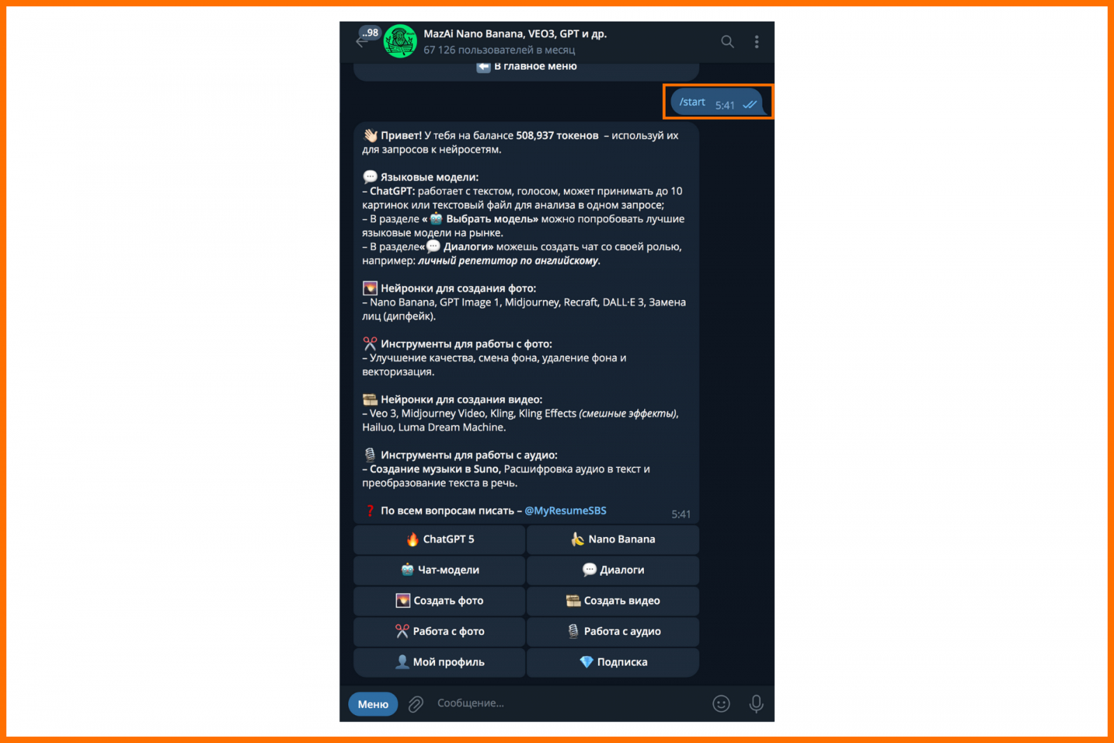 Шаг 1. Кликните по этой ссылке и запустите бота нажатием кнопки “Старт”: