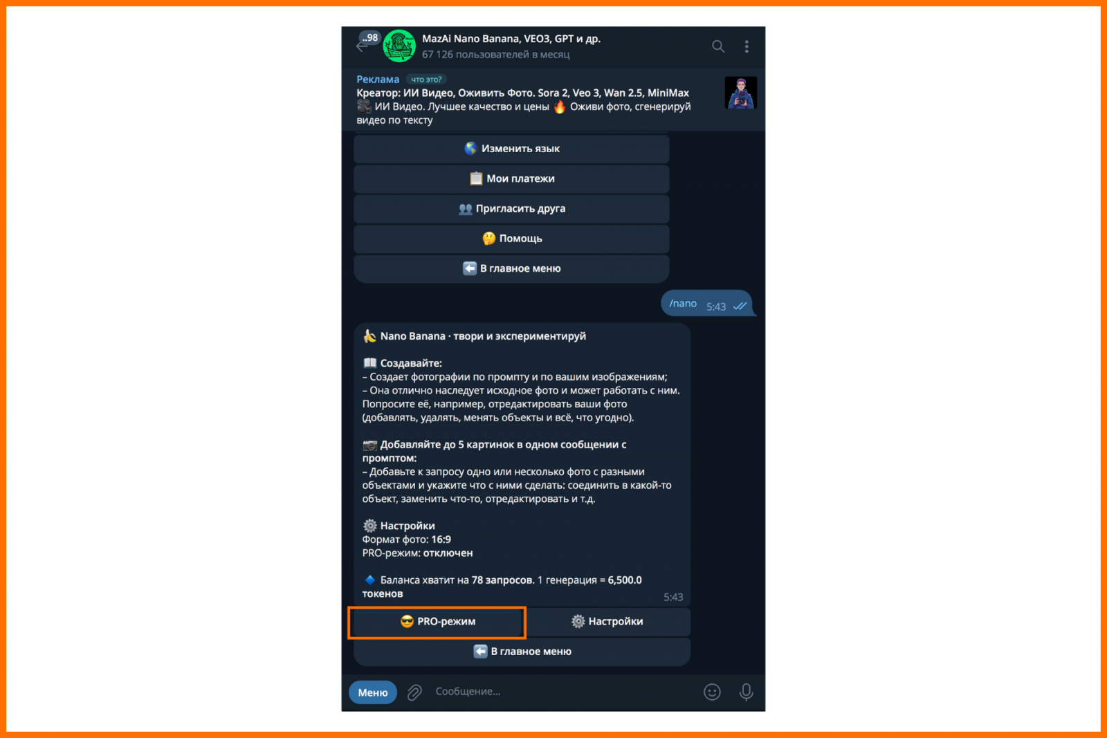 В этом боте (ссылка) есть подписка за 99 рублей. Оплатить можно с российской карты и через Telegram Stars. На балансе появится 150 000 токенов + 10 000 стартовых токенов, если вы новый пользователь. Этого хватит на 5 генераций в Nano Banana PRO. Один снимок обойдется всего в 17 рублей (26 000 токенов).