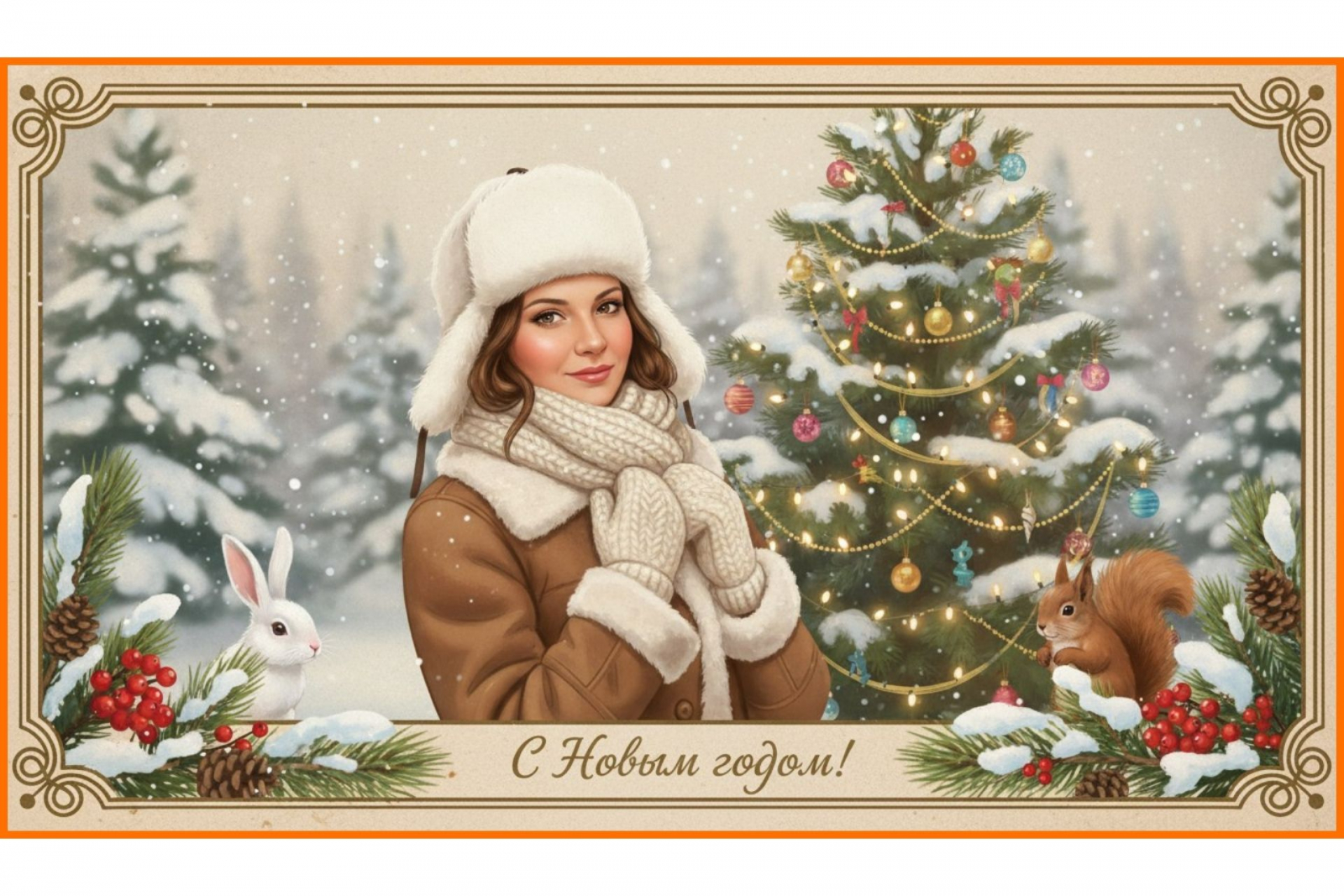 Промпт: Правило: Используй персонажа с прикрепленного фото; сохрани точные черты лица/мимику и пропорции, без мультяшности. Промт: Вертикальная новогодняя открытка в стиле ретро-иллюстрации. В кадре только человек, который есть на прикрепленном фото, одет в зимние вещи: шубу или дубленку светлых/коричневых тонов, меховую шапку/ушанку, шарф и варежки. Черты лица натуральные, кожа с легким морозным румянцем, живые глаза — фотореалистичная детализация при мягком живописном штрихе. Фон: заснеженный ельник и наряженная елка с гирляндами и шарами; легкая метель, теплые золотистые огни. Передний план: заснеженные ветви ели, шишки, красные ягоды; по желанию — лесные зверьки (заяц, белка). Цветокор: теплый праздничный, умеренный контраст, рассеянный зимний свет. Оформление: винтажная бумажная фактура, декоративная рамка; внизу каллиграфическое "С Новым годом!". Без логотипов.