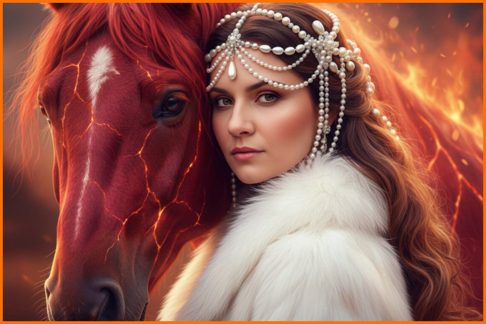 Промпт: Фантазийный портрет крупным планом созданный редакцией журнала Vogue для журнала о высокой моде, воссоздающий точную сцену: интимный плотный портрет, обрамленный от плеч и выше, женщина с фото-референса слегка повернута в три четверти к камере со спокойным, неземным выражением лица и прямым магнетическим взглядом, нежно опирающаяся на шею величественного огненно-красного коня, их лица в кадре расположены близко друг к другу, она одета в белую шубу из натурального меха с богатой органической текстурой, видимой в мельчайших деталях, ее волосы щедро украшены многочисленными жемчужными украшениями — многослойные жемчужные пряди, гроздья и капли, плотно вплетенные в волосы, образуют роскошную корону, обрамляющую лицо и ниспадающую каскадами по вискам, изысканный макияж, подчеркивающий фарфоровую кожу, нежный румянец и естественные губы. Лошадь, изображенная как живое воплощение огня с глубокими малиновыми тонами, светящимися расплавленными трещинами. Частично видна грива струящихся языков пламени.