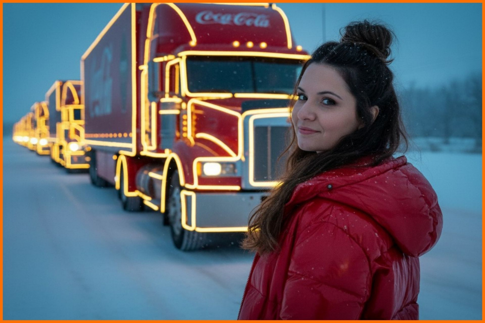 Промпт: На заснеженной зимней дороге, где мягкий хруст снега под ногами сливается с глубокими сине-голубыми сумерками, женщина с референсного фото стоит в легком пол-обороте, корпус развернут влево, а лицо оборачивается через плечо к камере. Волосы длинные темные густые, собраны в небрежный верхний пучок, с выбравшимися прядями у лица, и на них оседают мелкие снежинки. Улыбка — легкая искренняя. На модели — объемный красный глянцевый пуховик, на ткани заметны снежные хлопья. Позади — целая праздничная колонна грузовиков Coca-Cola, передний огромный красный трейлер с насыщенным брендовым глянцем приближается ближе всех, а по его кабине и прицепу идут идеально ровные линии ярко-желтых неоновых контурных огней, очерчивающих каждую грань — капот, арки, решетку, вертикали кузова, боковые панели и длинные направляющие на прицепе. Камера расположена на уровне груди, чуть сдвинута вправо, кадр по грудь, фон мягко разграничен по глубине — близкий план четкий, дальний читаемый, но не резкий. Изображение четкое в разрешении 8к.