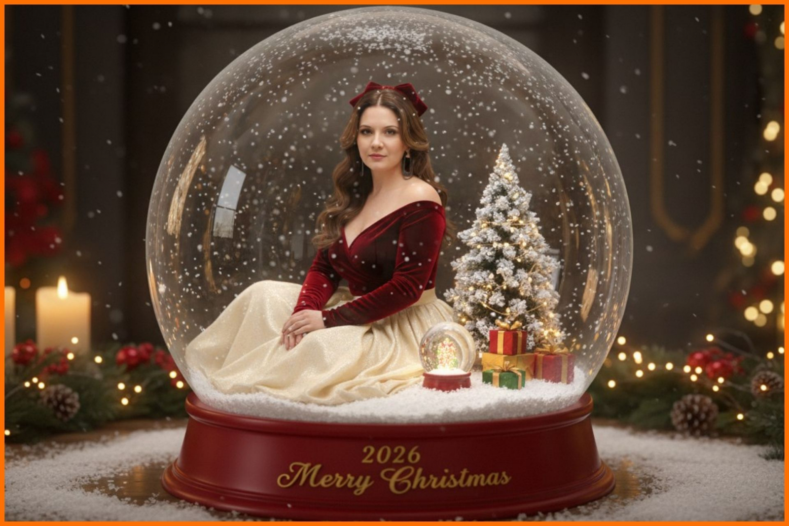 Промпт: Используй предоставленное изображение человека, полностью сохрани все черты лица, прическу, пропорции и индивидуальность. Создай ультрареалистичную сцену в рождественском снежном шаре. Человек с эталонного фото грациозно сидит на мягком снегу, одетый в темно-красный бархатный топ с открытыми плечами, объемную кремово-золотистую юбку и красный бант в волосах. Используй мягкое кинематографическое освещение и легкий снегопад внутри шара. Добавь рядом с человеком миниатюрную заснеженную рождественскую елку, небольшие упакованные подарки и крошечный светящийся снежный шар. Обеспечь реалистичные отражения в стекле, нежные снежинки на куполе и теплую праздничную цветовую палитру. Основание шара красное с золотым текстом “2026 Merry Christmas”. Окружение включает в себя ненавязчивые элементы праздничного декора в высокодетализированном, элегантном, волшебном рождественском стиле.