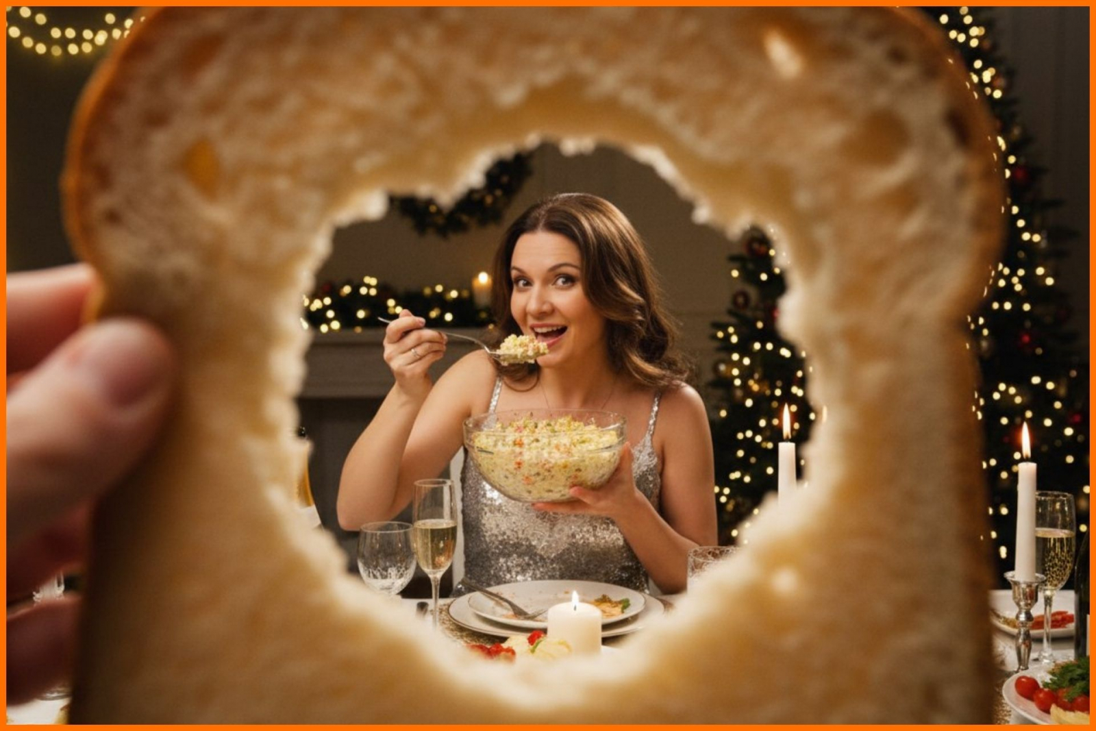 Промпт: Юмористическая кинематографическая праздничная сцена, вид через рваное отверстие в ломтике хлеба, который держит рука другого человека близко к камере. Ломтик хлеба имеет неровный естественный разорванный край в центре, почти не оставив мякиша,только корочка, создающий виньетку-рамку. Через это отверстие в хлебе мы четко видим женщину с фото-референса, сидящую за праздничным новогодним столом. Она одета в красивое праздничное платье и смотрит озорно в камеру (элегантное, вечернее, праздничный стиль). В руках она держит большую миску с салатом оливье, делает вид, что ест его ложкой с немного преувеличенным, юмористическим удовольствием. Детали сцены: новогодний стол с традиционными украшениями — бокалы с шампанским, боке от гирлянд, возможно, свечи. Обрамление через хлеб резкое по краям, с малой глубиной резкости. Ломтик хлеба очень близко к линзе, текстурированный, реалистичный, хрустящий. Женщина и стол в фокусе через отверстие. Фон: праздничная атмосфера, сверкающие огни, мягкое размытие.