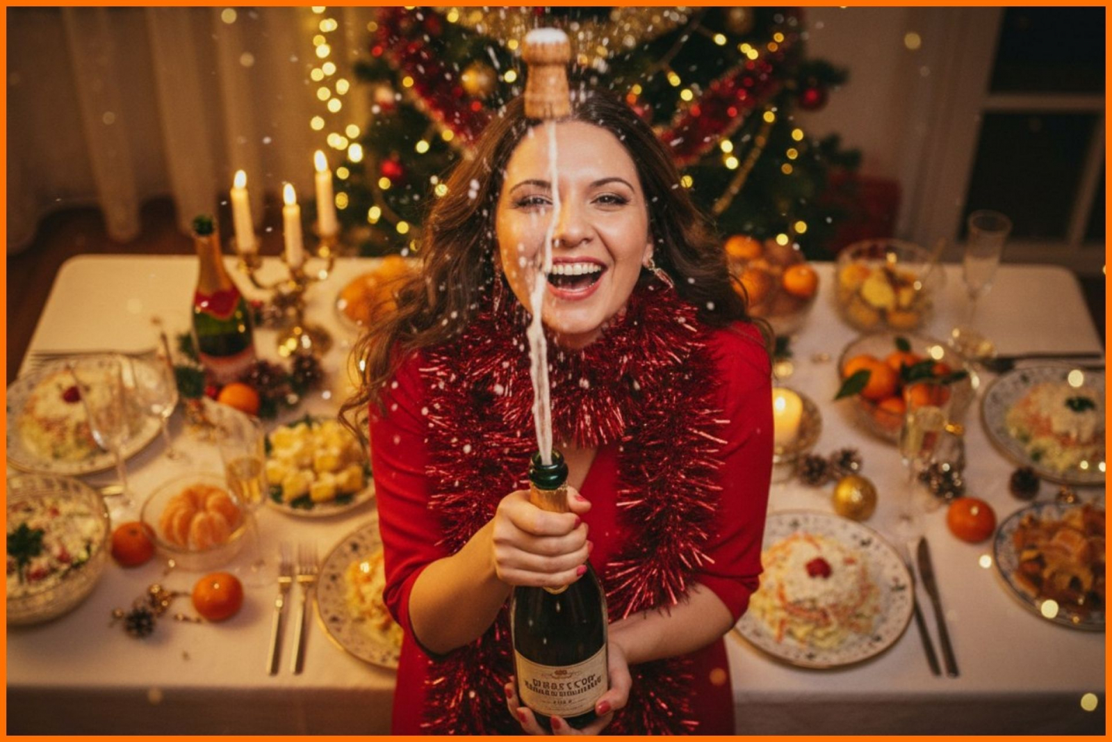 Промпт: Юмористическая кинематографическая праздничная сцена, вид сверху, женщина с фото-референса с восторгом и смеясь смотрит на пробку от шампанского, которая с брызгами летит прямо в камеру, естественна и кинематографично видна до мельчайших подробностей. Женщина видна четко в новогоднем праздничном платье с новогодней мишурой красной на шее, держит в руках бутылку советского шампанского, черты лица женщины не менять с исходного фото, она стоит за праздничным новогодним столом с салатами и бокалами и мандаринами. Детали сцены: новогодний стол с традиционными украшениями — бокалы с шампанским, боке от гирлянд, возможно свечи и видно новогоднюю елку, украшенную гирляндами, немного размыто ее изображение. Теплое уютное освещение, мягкое золотистое праздничное сияние. Женщина и стол в фокусе. Фон: праздничная атмосфера, сверкающие огни, мягкое размытие. Настроение: смешное, теплое, слегка абсурдный новогодний юмор. Ультрареалистичный, 8K, малая глубина резкости, кинематографическая праздничная эстетика.