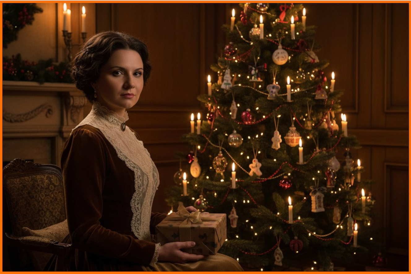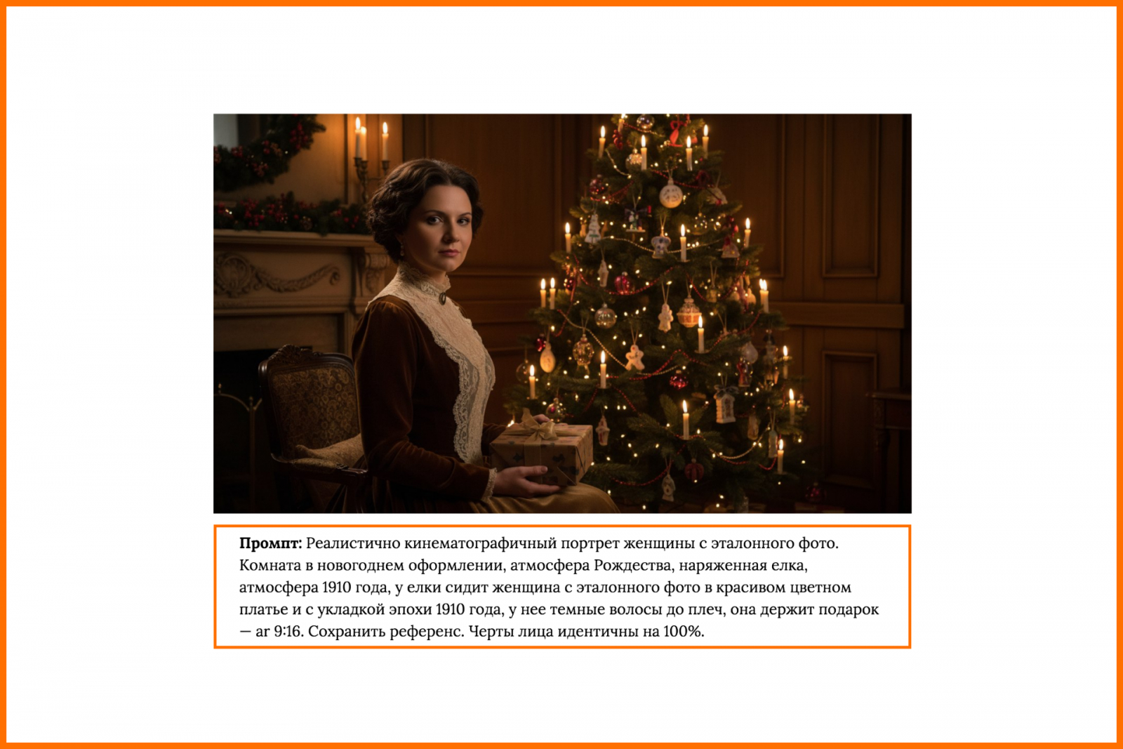Промпт: Реалистично кинематографичный портрет женщины с эталонного фото. Комната в новогоднем оформлении, атмосфера Рождества, наряженная елка, атмосфера 1910 года, у елки сидит женщина с эталонного фото в красивом цветном платье и с укладкой эпохи 1910 года, у нее темные волосы до плеч, она держит подарок — ar 9:16. Сохранить референс. Черты лица идентичны на 100%.
