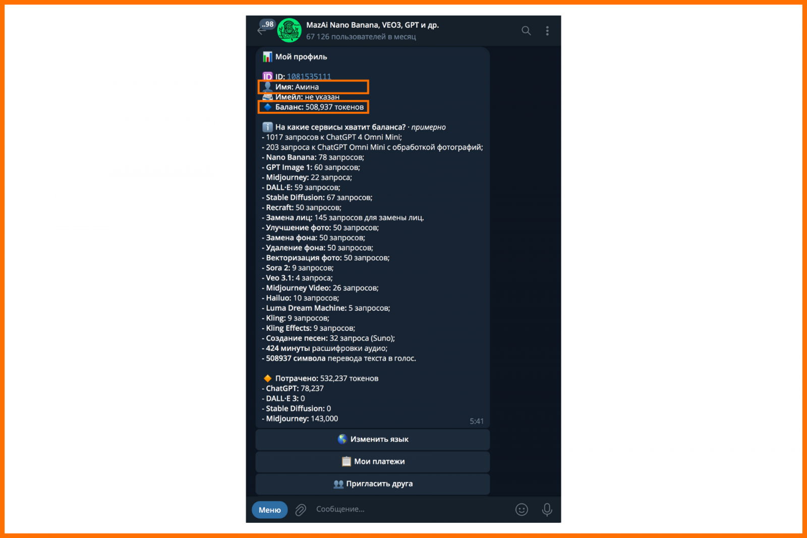 Шаг 2. Сообщите свое имя (данные банковской карты не понадобятся) — и на балансе появятся 10 000 токенов — это внутренняя валюта бота, которой хватит на одну бесплатную генерацию ИИ фотографии в Nano Banana: