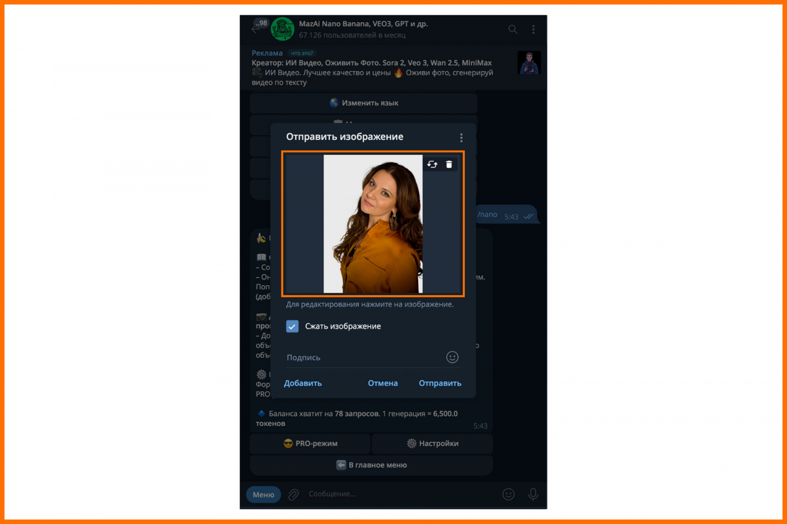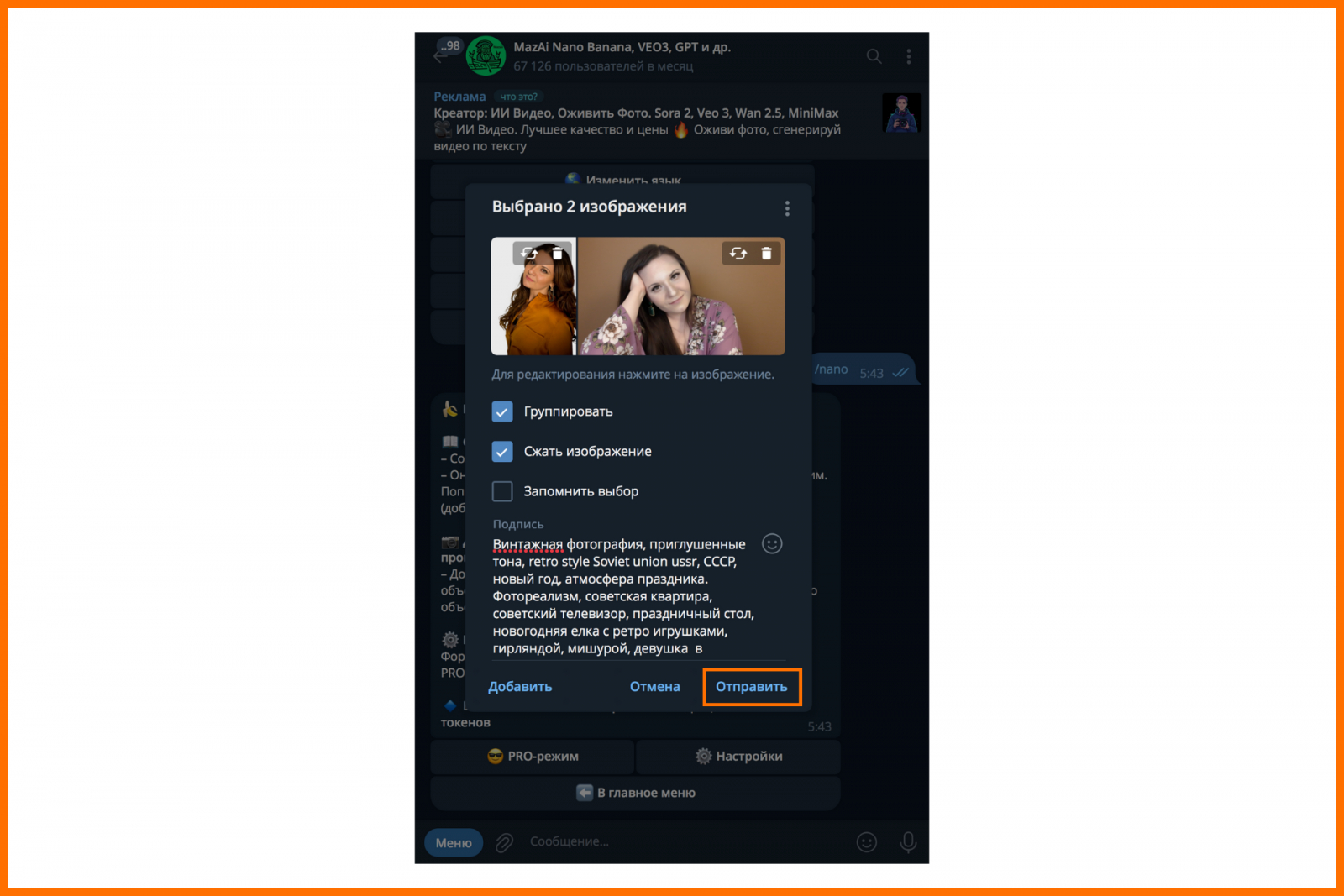 Шаг 6. Если загружаете несколько снимков, поставьте галочку напротив настроек “Сжать изображение” и “Группировать”. Это важно — иначе все фото отправятся боту отдельными сообщениями, и он не поймет, что с ними делать. Бесплатная генерация будет потрачена зря: