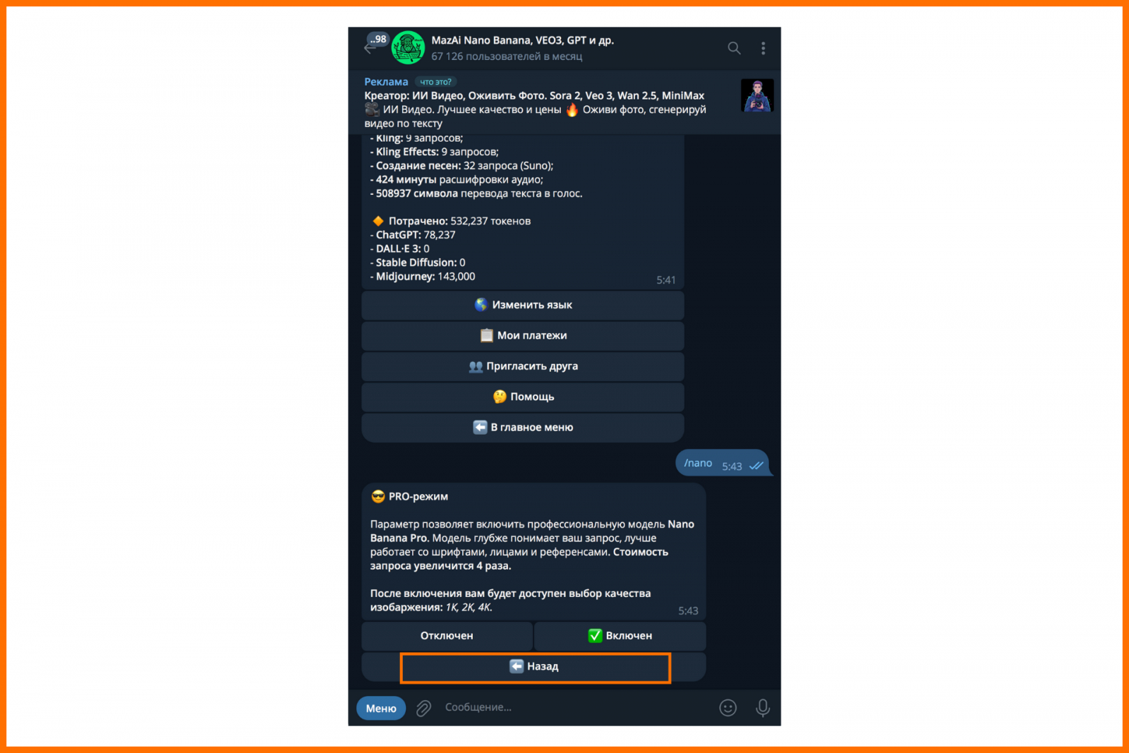 В этом боте (ссылка) есть подписка за 99 рублей. Оплатить можно с российской карты и через Telegram Stars. На балансе появится 150 000 токенов + 10 000 стартовых токенов, если вы новый пользователь. Этого хватит на 5 генераций в Nano Banana PRO. Один снимок обойдется всего в 17 рублей (26 000 токенов).