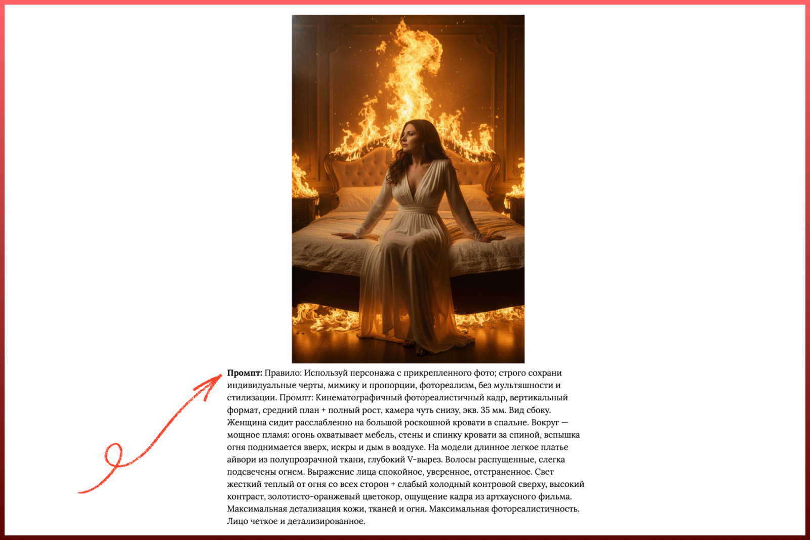Промпт женский: Правило: Используй персонажа с прикрепленного фото; строго сохрани индивидуальные черты, мимику и пропорции, фотореализм, без мультяшности и стилизации. Промпт: Кинематографичный фотореалистичный кадр, вертикальный формат, средний план + полный рост, камера чуть снизу, экв. 35 мм. Вид сбоку. Женщина сидит расслабленно на большой роскошной кровати в спальне. Вокруг — мощное пламя: огонь охватывает мебель, стены и спинку кровати за спиной, вспышка огня поднимается вверх, искры и дым в воздухе. На модели длинное легкое платье айвори из полупрозрачной ткани, глубокий V-вырез. Волосы распущенные, слегка подсвечены огнем. Выражение лица спокойное, уверенное, отстраненное. Свет жесткий теплый от огня со всех сторон + слабый холодный контровой сверху, высокий контраст, золотисто-оранжевый цветокор, ощущение кадра из артхаусного фильма. Максимальная детализация кожи, тканей и огня. Максимальная фотореалистичность. Лицо четкое и детализированное.
