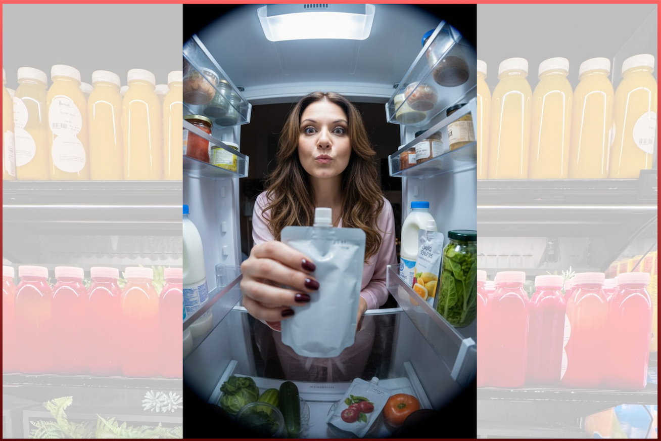 Промпт: Правило: Используй персонажа с загруженного фото; сохрани черты лица, мимику и пропорции. Максимальный фотореализм, без мультяшности, стилизации. Промпт: lifestyle-портрет «inside the fridge moment». Вертикальный кадр, съёмка изнутри открытого холодильника, сильная перспектива. Камера на уровне глаз, экв. 24–35 мм, заметная дисторсия по краям, малая–средняя ГРИП. Персонаж стоит перед холодильником, удивлённо-игривое выражение лица, широко раскрытые глаза, губы слегка сжаты. Одежда: розовая пижама. Правая рука на переднем плане тянется к камере, держит мягкую упаковку фруктового пюре, стоящую на полке (без логотипа); пальцы с бордовым маникюром, резкий фокус на руке. В кадре полки холодильника с продуктами без читаемых логотипов. Свет холодный, жёсткий, источник — лампа холодильника сверху, создаёт контраст и блики в глазах. Атмосфера спонтанная, домашняя, ощущение момента. Цветокор холодно-нейтральный, высокий микроконтраст, максимальная детализация. Цель — неотличимая от реальной профессиональная фотография.