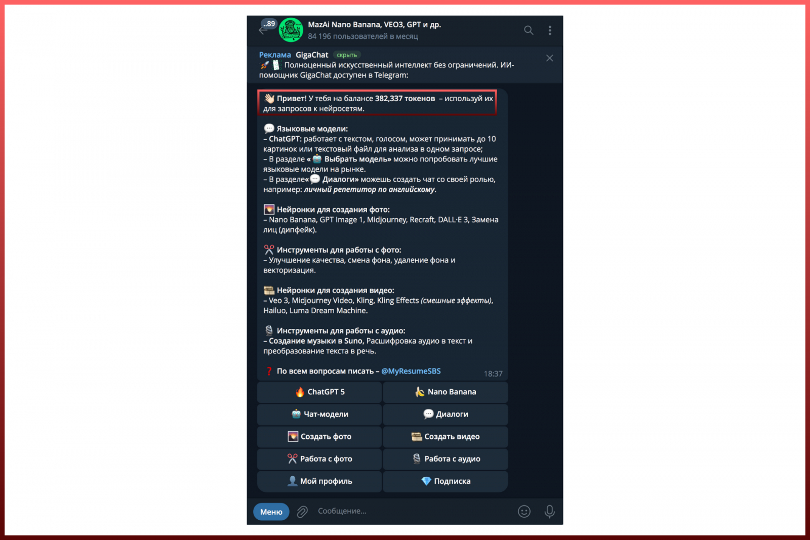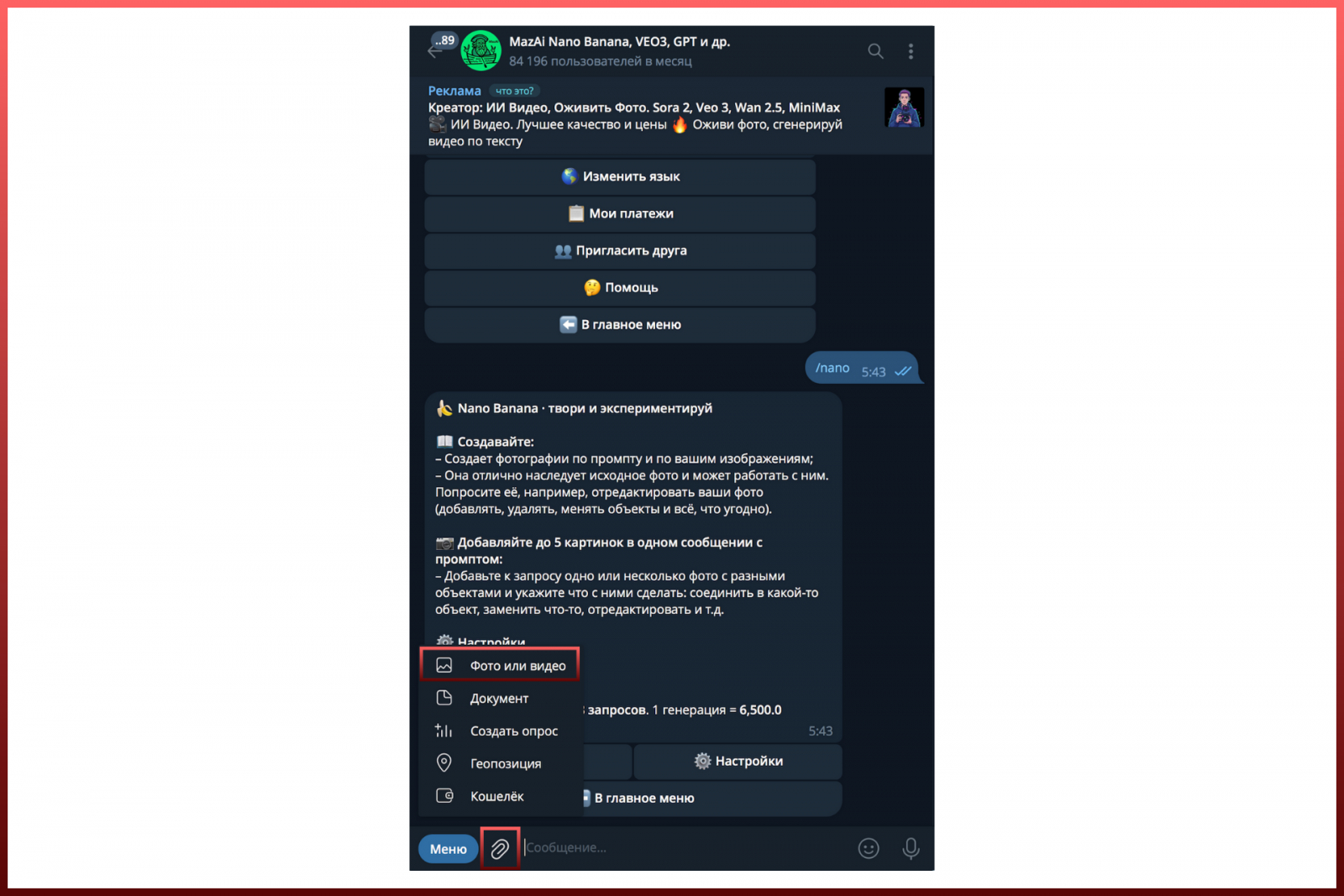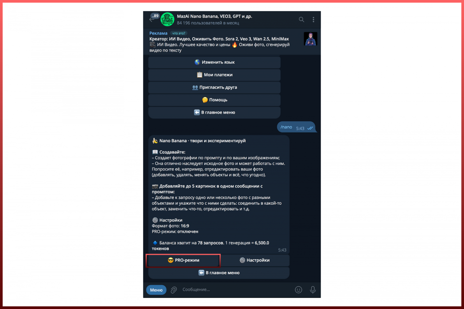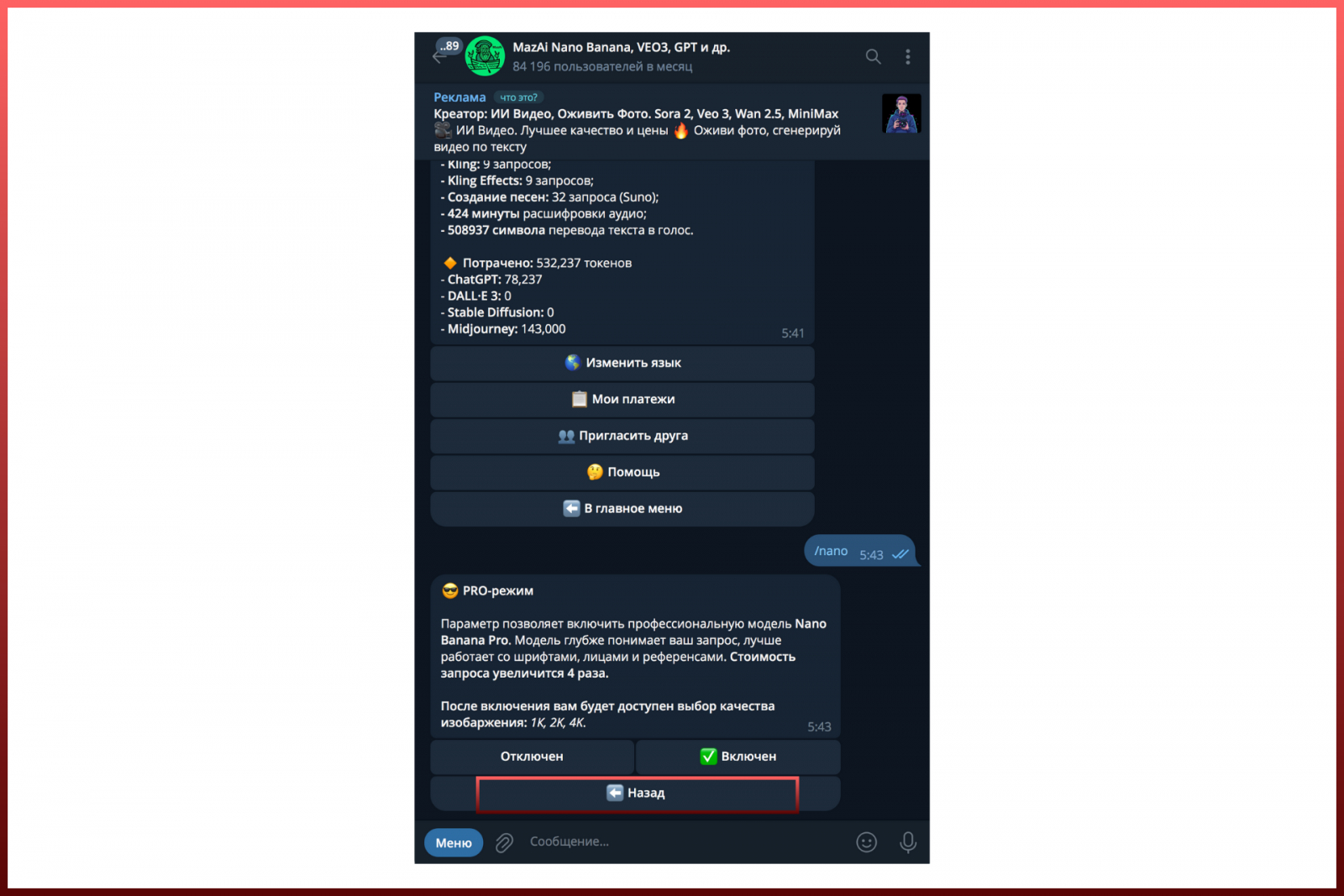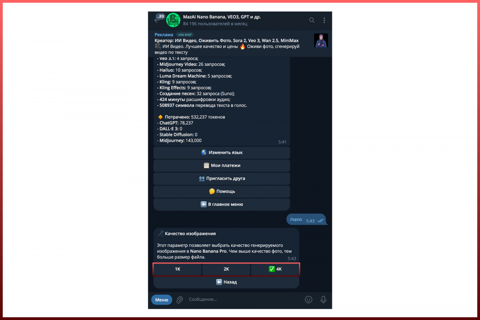 Сразу скажу, что воспользоваться Nano Banana PRO бесплатно не получится — бот спишет 26 000 токенов с баланса. Но это и не так дорого — например, если купить тариф за 99 рублей, у вас будет 5 фотографий 4К-качества по 17 рублей каждый.