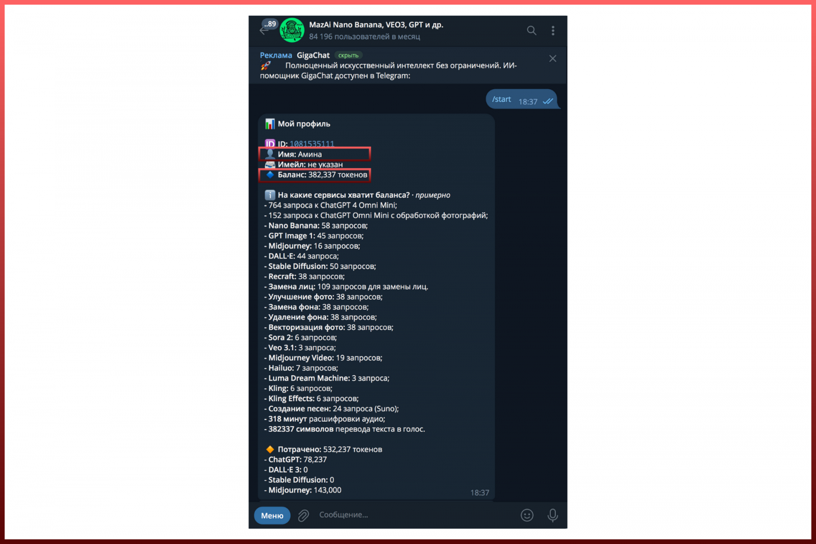 В Telegram-боте Ai_dai (ссылка) доступна подписка стоимостью 99 рублей с возможностью оплаты российской картой или через Telegram Stars. После активации на баланс начисляется 150 000 токенов, а новым пользователям дополнительно дают 10 000 стартовых. Этого хватает на пять генераций в Nano Banana (обычном).