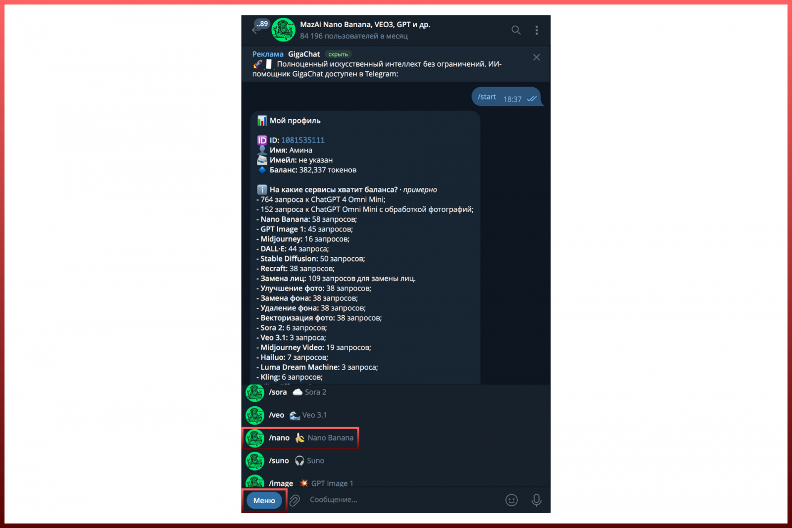 Шаг 3. Разверните “Меню” и найдите Nano Banana: