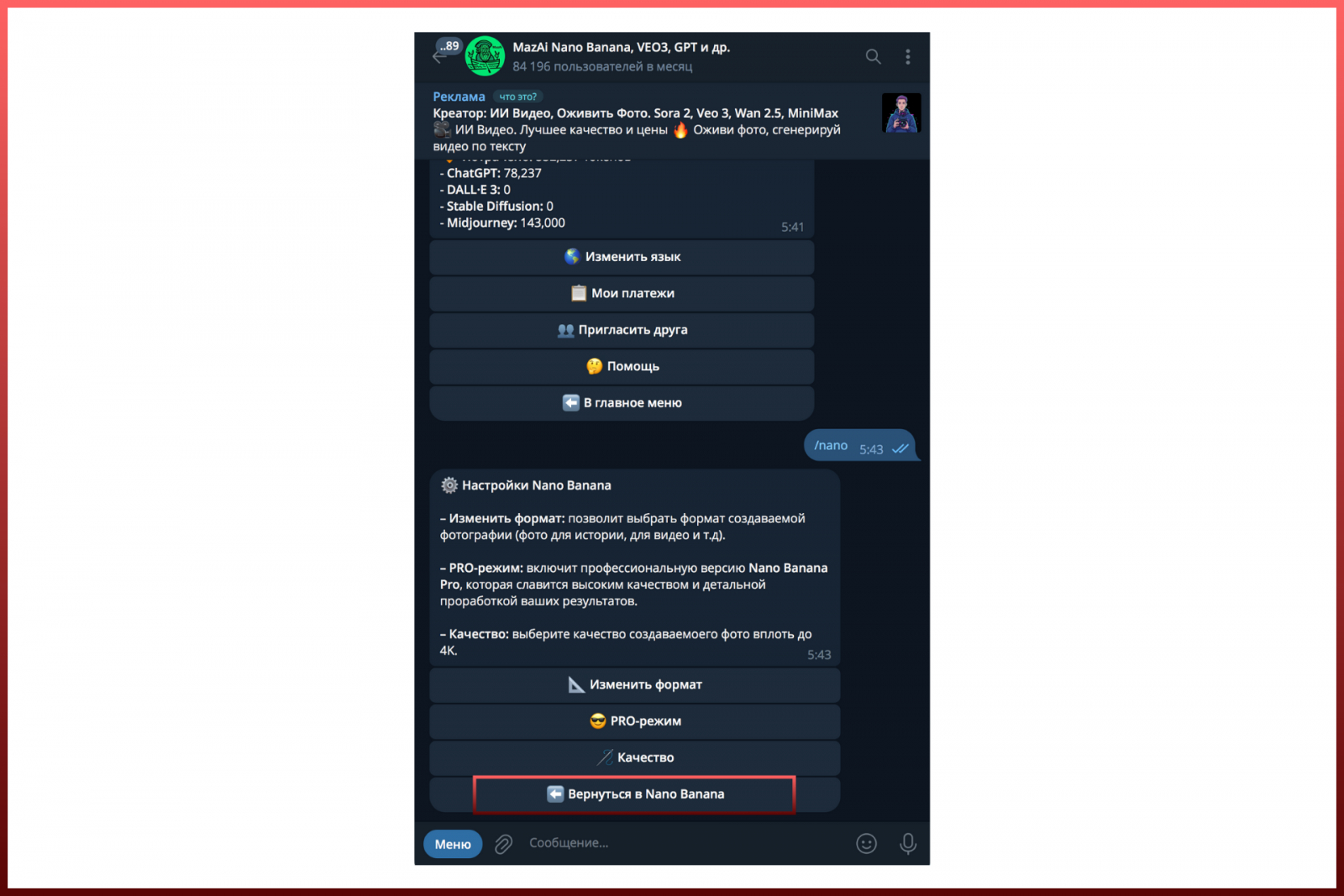 Шаг 9. Нажмите “Отправить” — и бот передаст запрос на официальный сайт Nano Banana. В ответ придет готовый снимок: