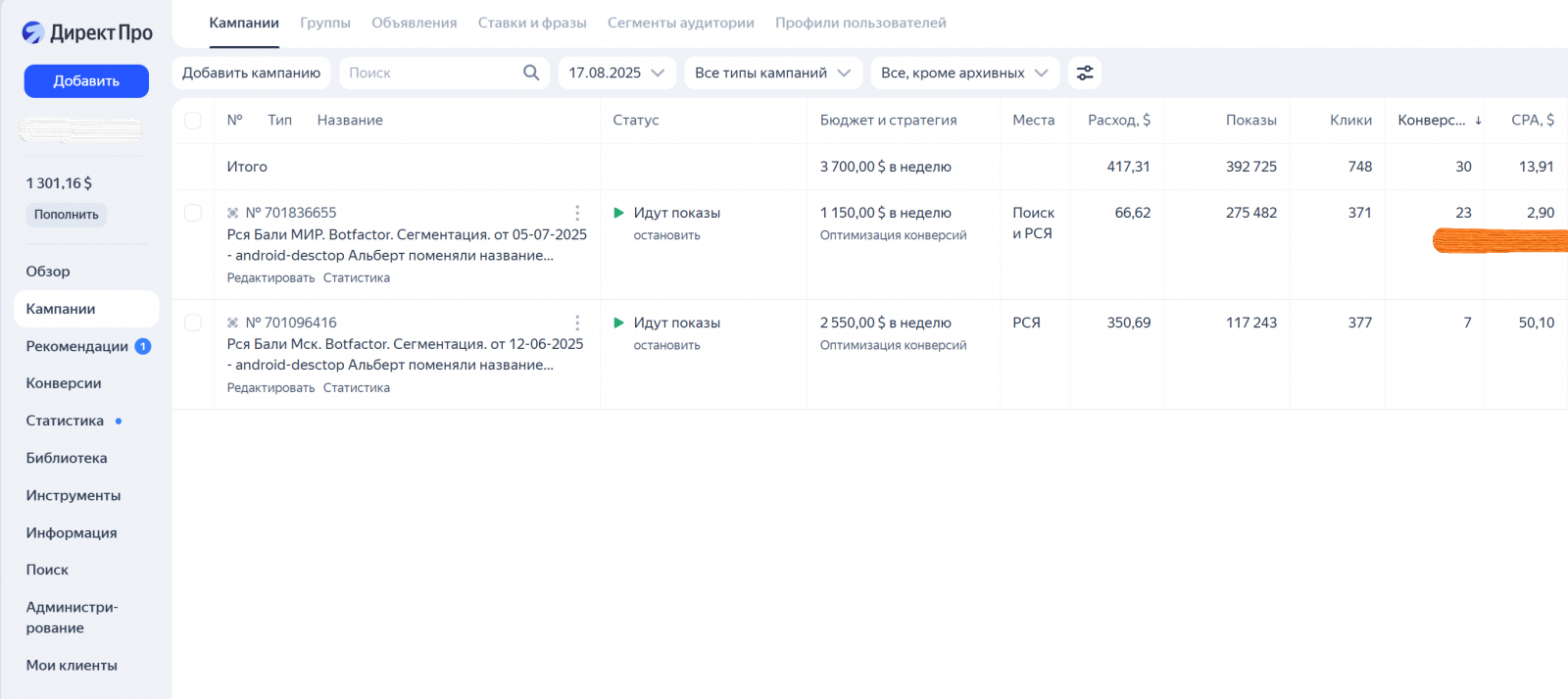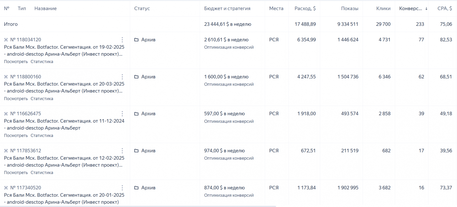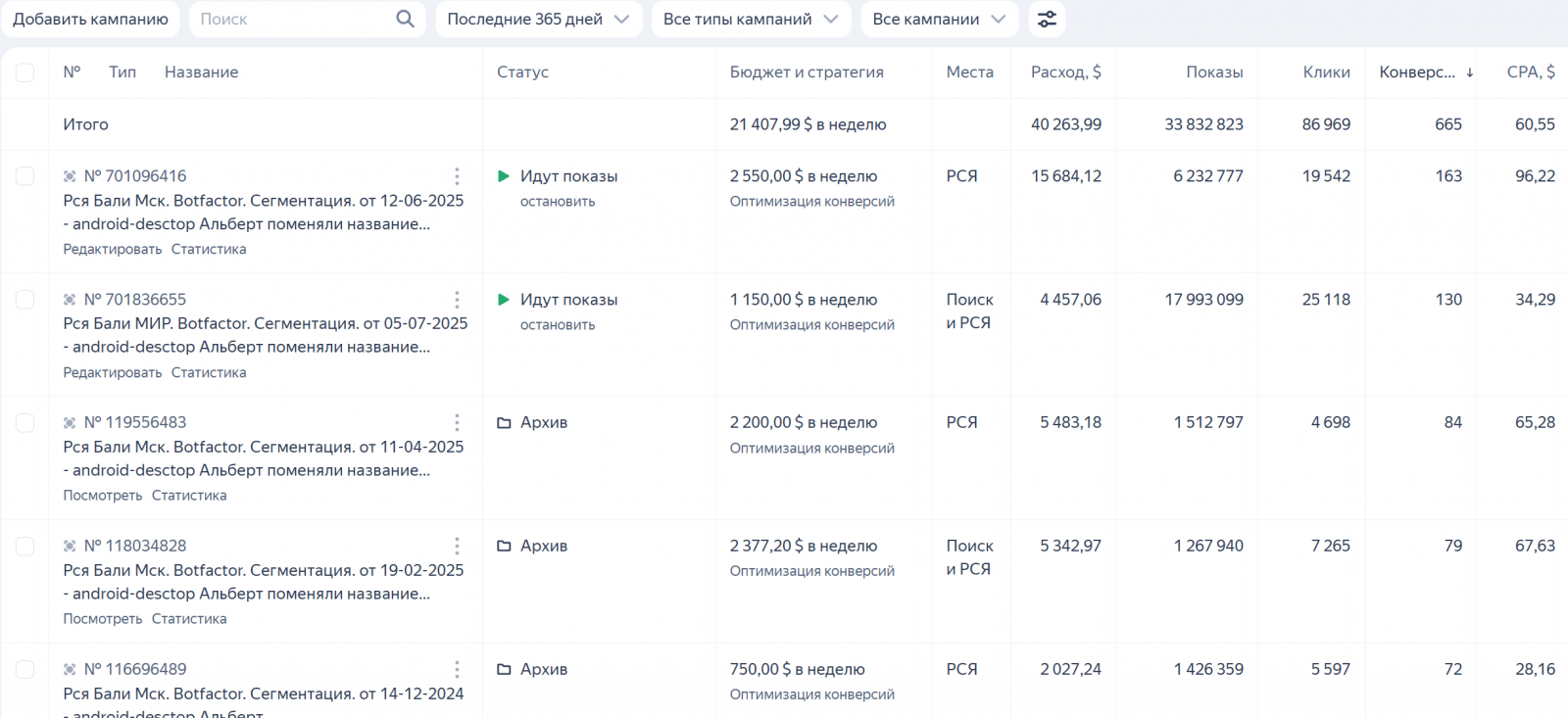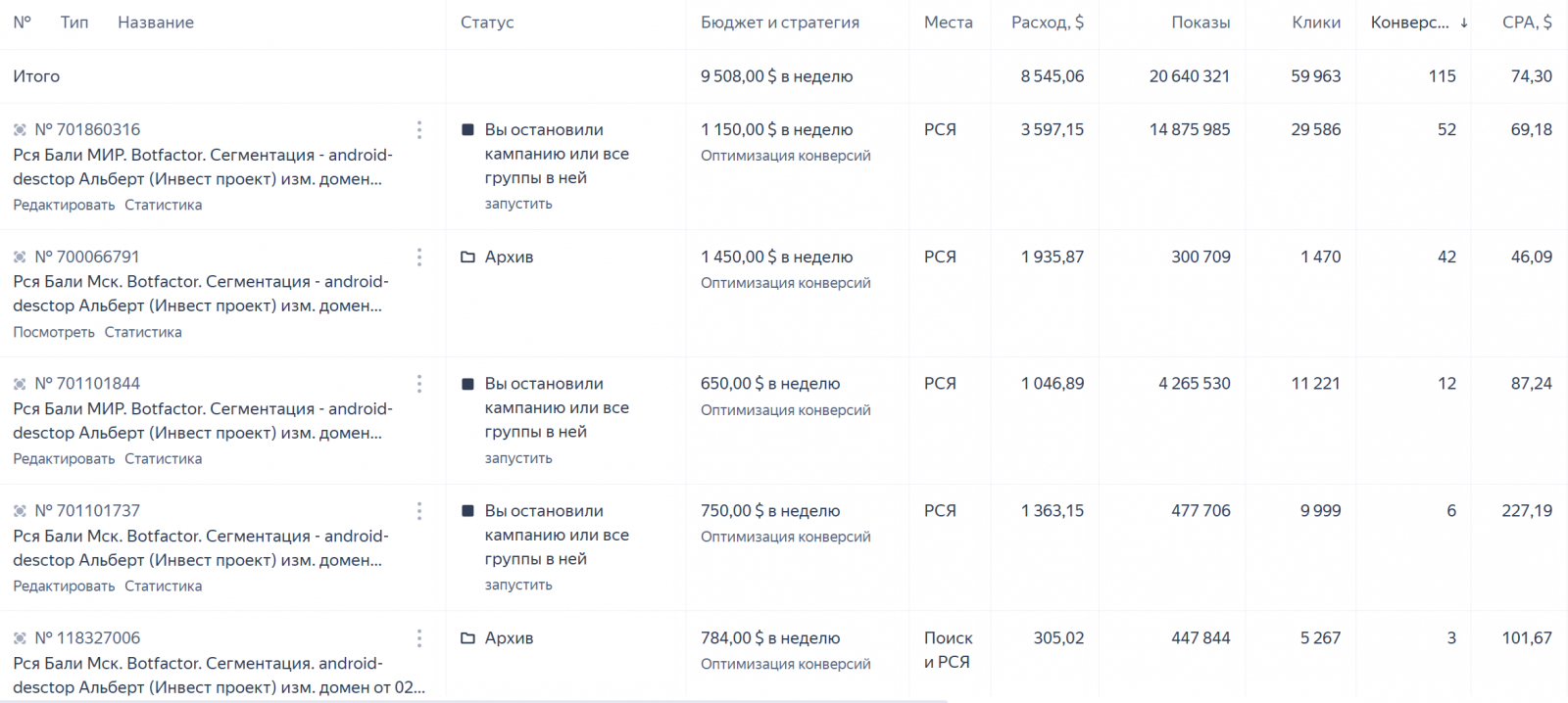 Остальные лиды в тот момент агентство обрабатывать не хотело. Попытка «продавить» аукцион за счёт бюджета (рост до $12 000, 4 рекламных кабинета, расширение семантики) привела к CPL от $183 и выше и нестабильным откруткам.