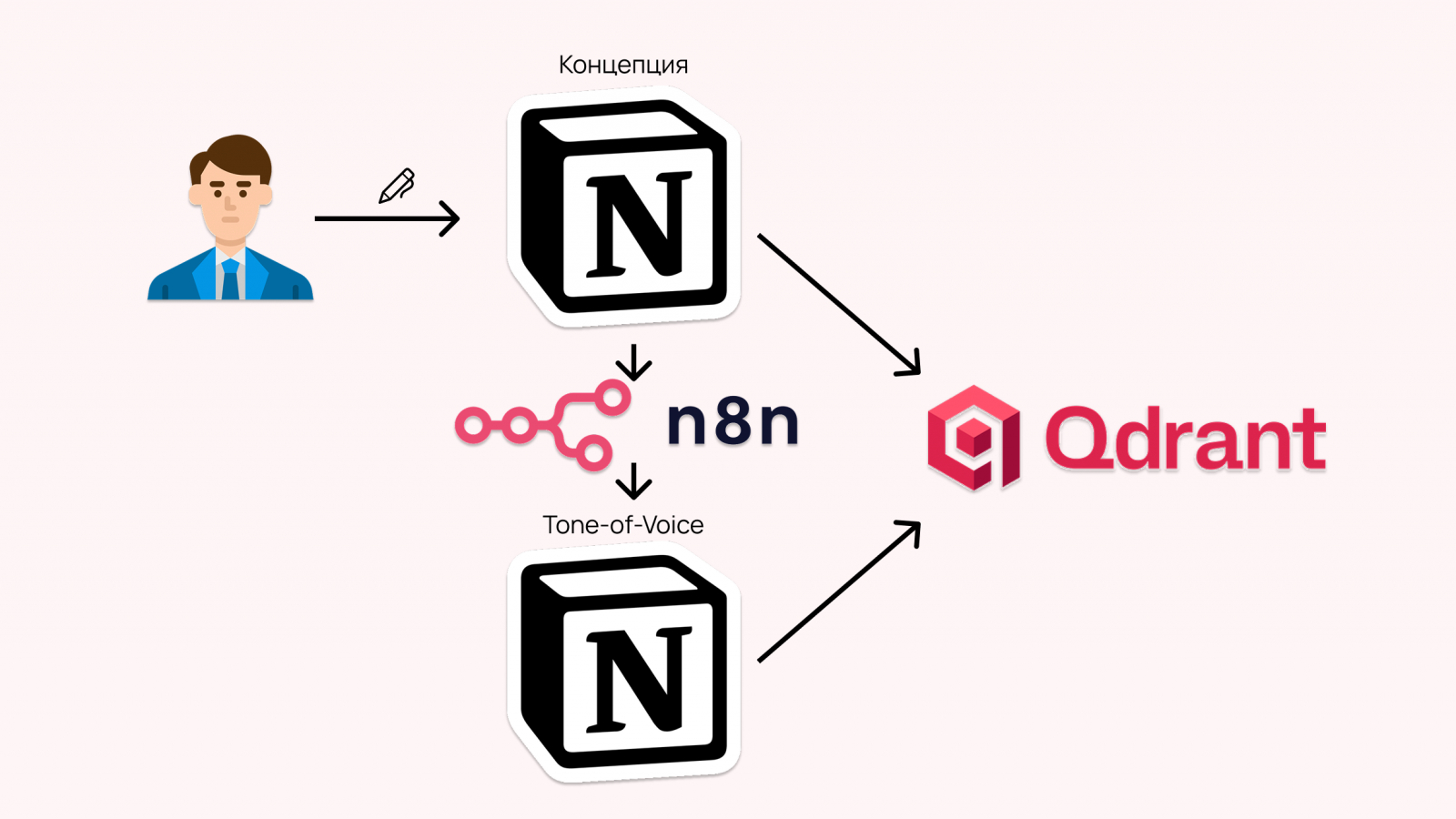 Итог, как работает создание памяти: Заказчик вносит данные в документ “Концепция” в Notion, эти данные автоматически обрабатываются и загружаются в векторную базу данных (RAG), затем на базе изменений формируется документ Tone of Voice, который тоже можно посмотреть в Notion, таким образом “память” системы у нас состоит из двух частей — одна отвечает за факты, другая за тон общения.