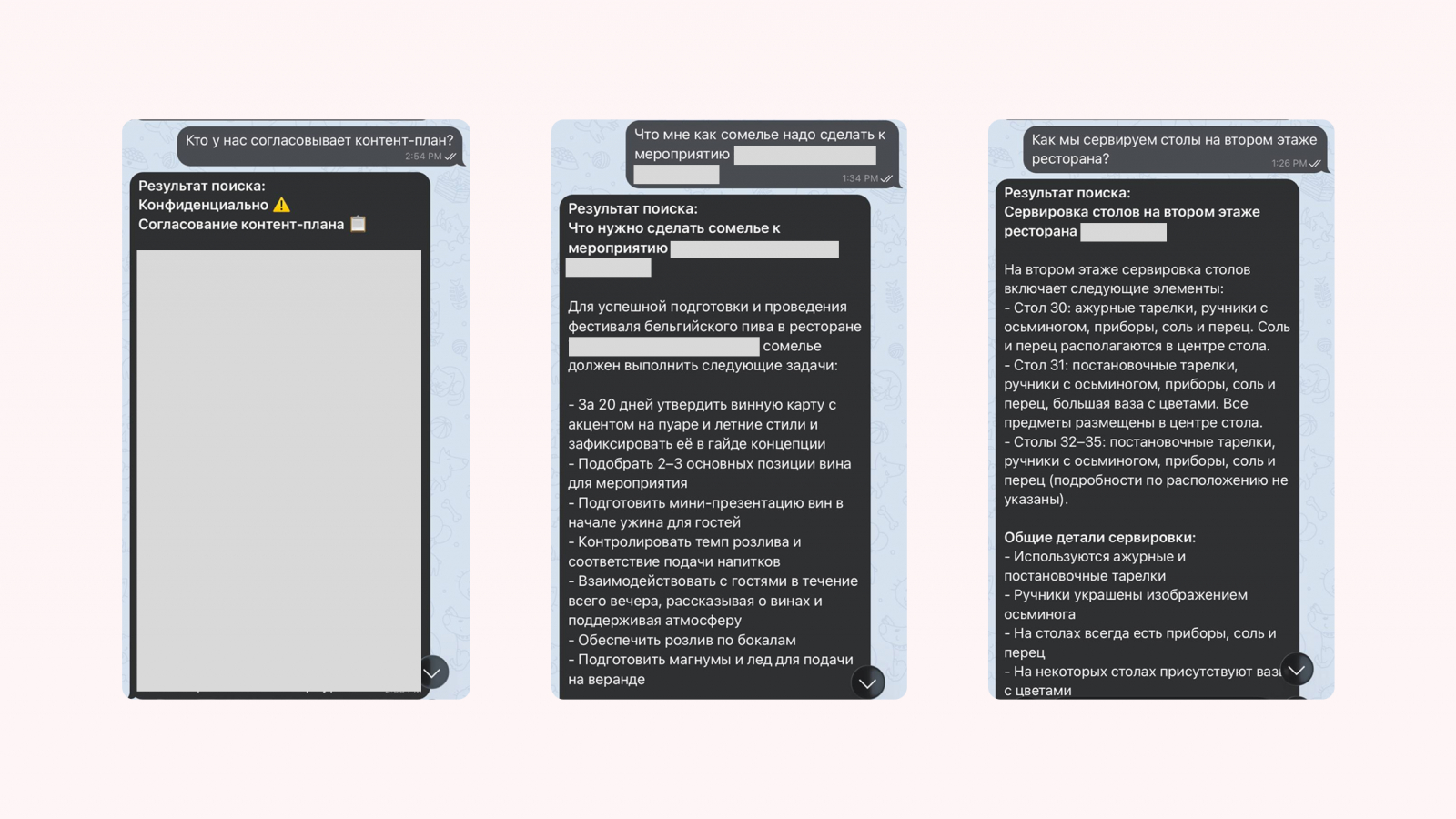 И самое главное — бот понимает смысл вопроса, а не ключевые слова. Он знает, кто спрашивает, и показывает только ту информацию, которую разрешено видеть: стандарты, описания ресторанов, контактные данные коллег, корпоративные политики, справки и документы.
