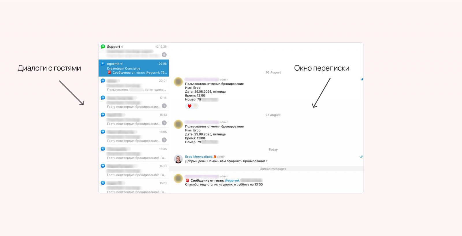 Из особенностей отмечу, что менеджер ресторана получает не просто информацию о брони, а еще уточнения, в которых содержатся комментарии гостя, его аллергены, предпочтения, информация, в случае, если бот заблокирован, различные пометки, что человек является участником программы лояльности и другие детали, которые позволяют ресторану оказывать персонализированный сервис.