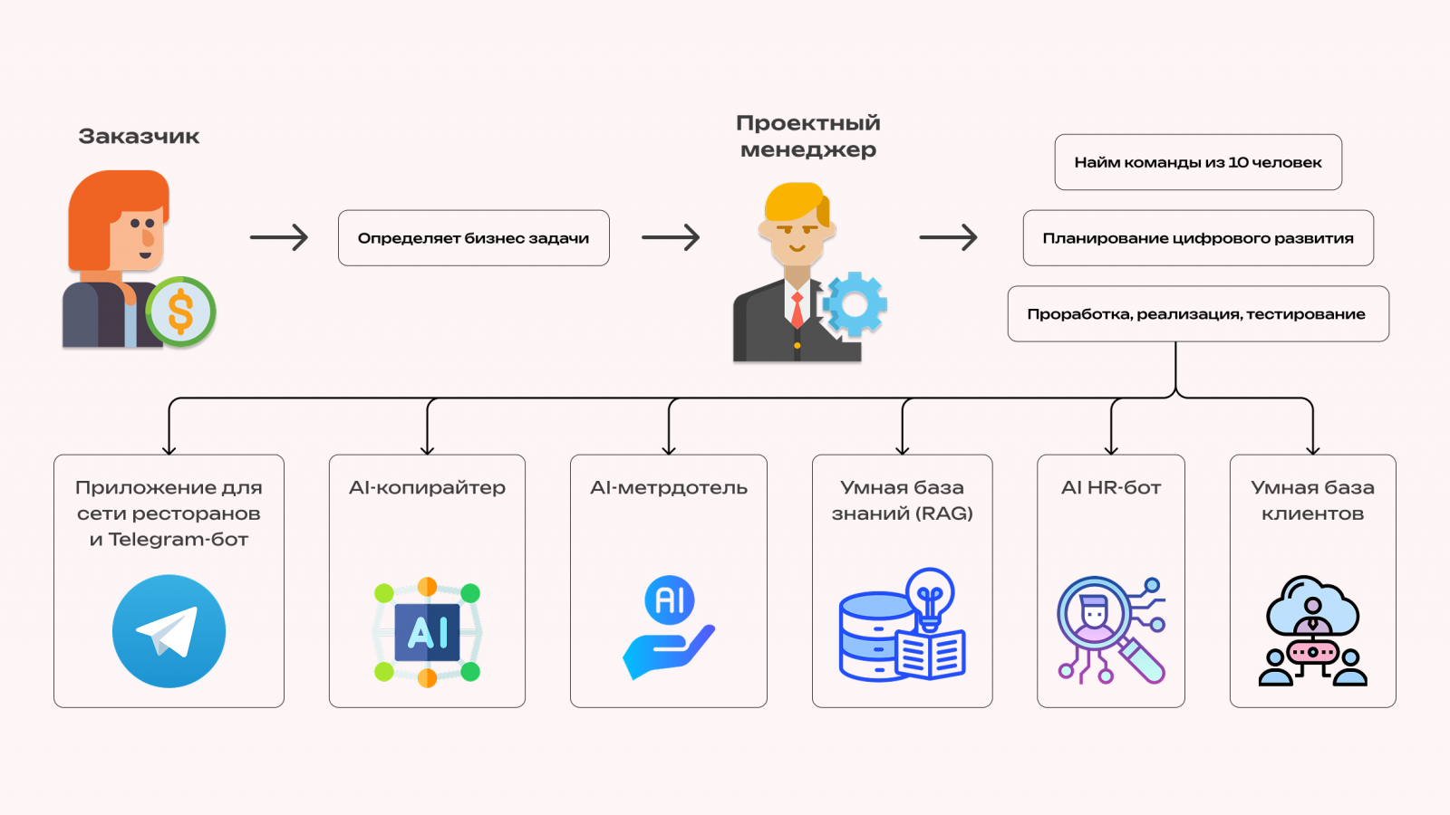 Как минимум, помимо разработки приложения, его нужно поддерживать и постоянно внедрять новые функции. Параллельно появлялись запросы на другие цифровые продукты, в том числе с использованием ИИ. Короче говоря, нужен был подрядчик который закрывает весь цифровой контур компании, от настройки серверов до приложений и продуктов по оптимизации.