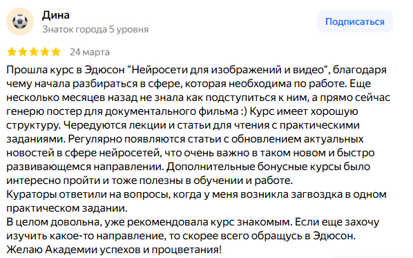 Прошла курс в Эдюсон "Нейросети для изображений и видео", благодаря чему начала разбираться в сфере, которая необходима по работе.