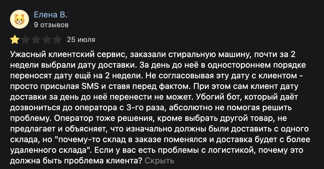 Большинство негативных отзывов связано не с самим товаром, а с сопутствующими услугами: доставкой и сервисом. Поэтому если вы покупаете мелкую технику и уносите ее из магазина сами, риск негативного опыта значительно снижается.