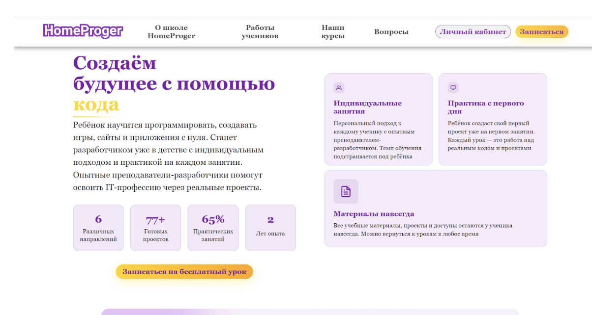 Направления: в Home Progger детям младшего школьного возраста и подросткам доступны блочное программирование и создание игр, разработка сайтов, кодинг на Python и альтернативные популярные образовательные программы.