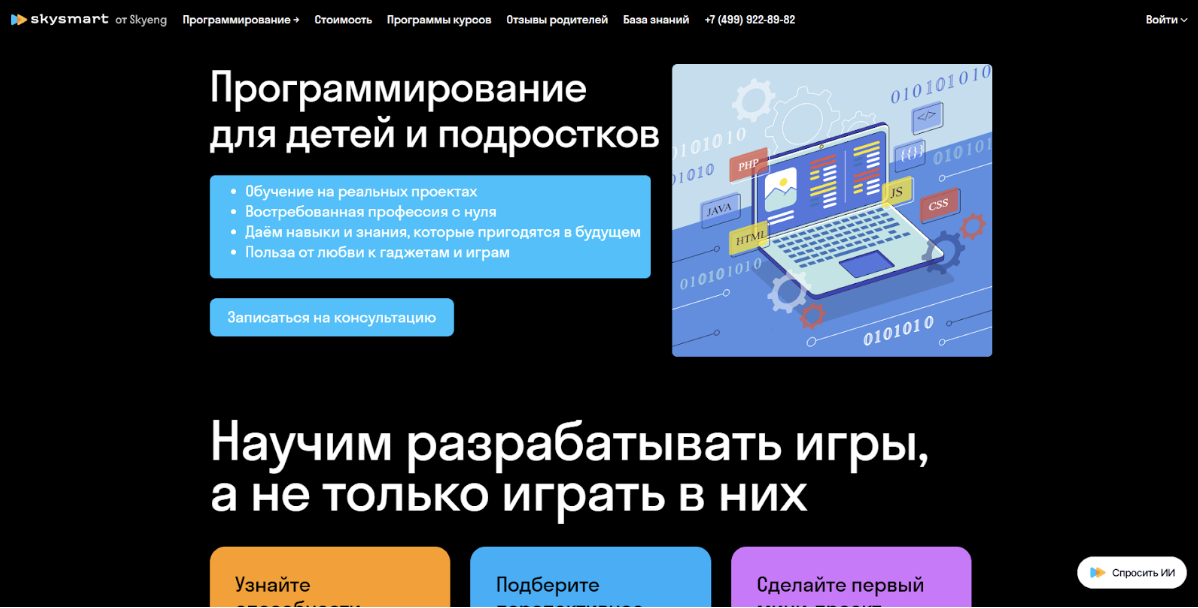 Направления: в Skysmart ребята различных возрастов могут освоить разработку на движке Roblox Studio, основы программирования на «Питоне», создание модов для Майнкрафта, теорию и практику использования «Юнити», веб-кодинг и т. д.