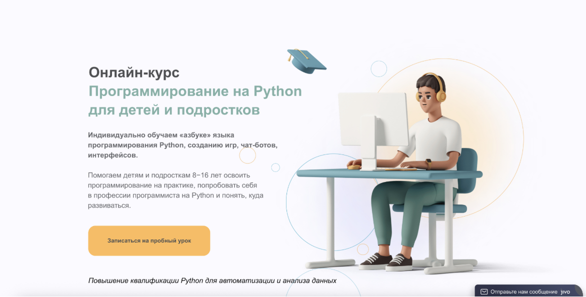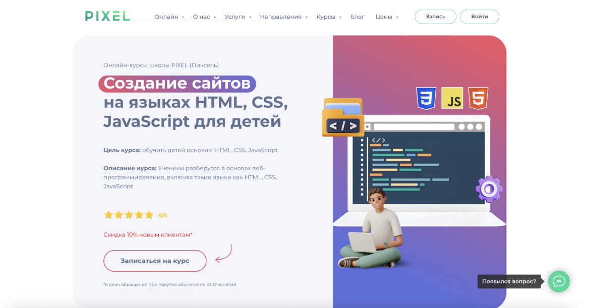 Онлайн-школа PIXEL занимает первое место в рейтинге благодаря системному и продуманному подходу к обучению веб-программированию школьников. Курс по созданию сайтов на языках HTML, CSS и JavaScript ориентирован на детей и подростков от 12 лет и подходит как для начинающих, так и для учеников с базовой подготовкой.