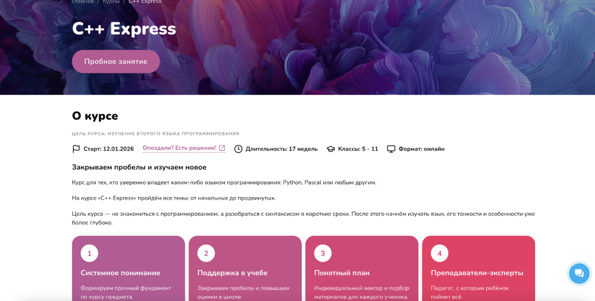 «C++ Express» — курс для школьников 5–11 классов, которые уже уверенно знают один язык программирования (например, Python, Pascal или другой) и хотят быстро освоить второй язык.
