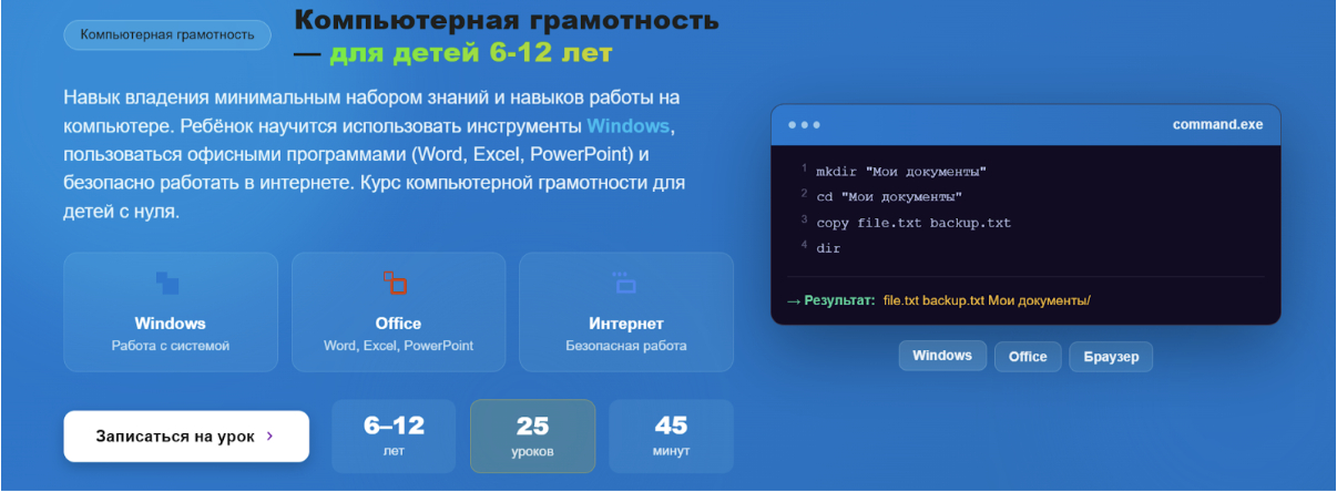 Темы: знакомство с Windows, использование офисных программ вроде Word, безопасная работа в сети и т. д.