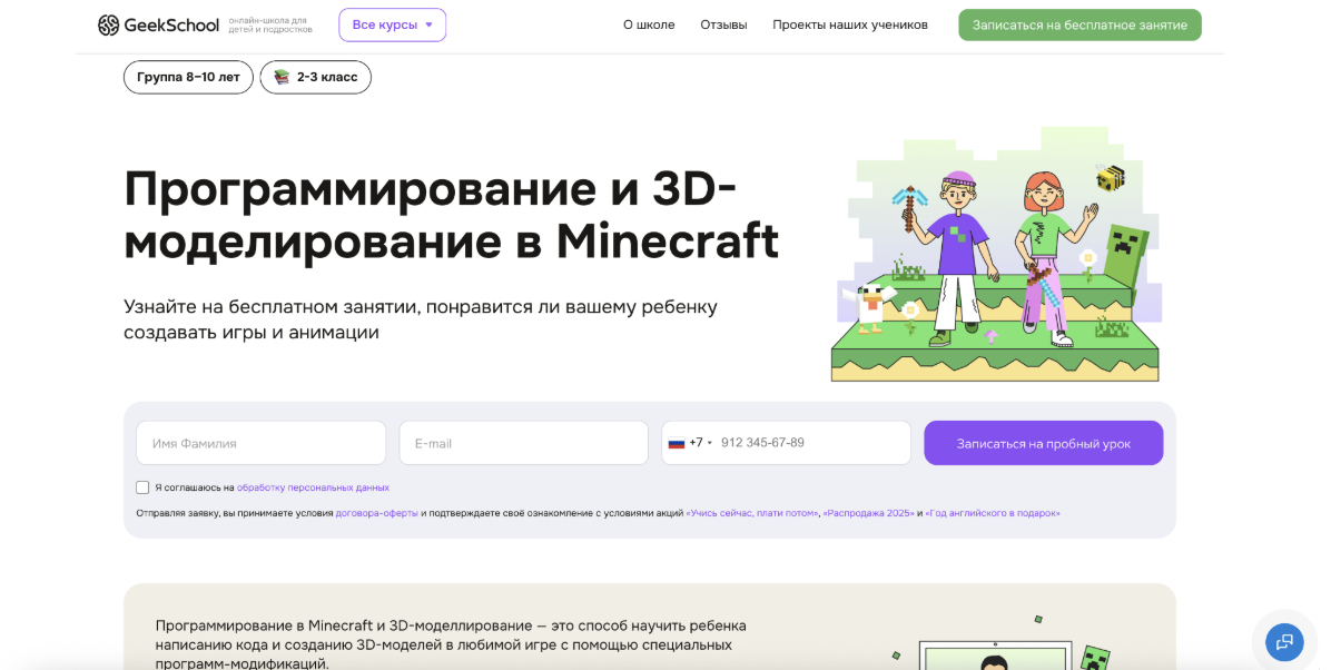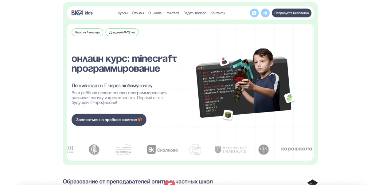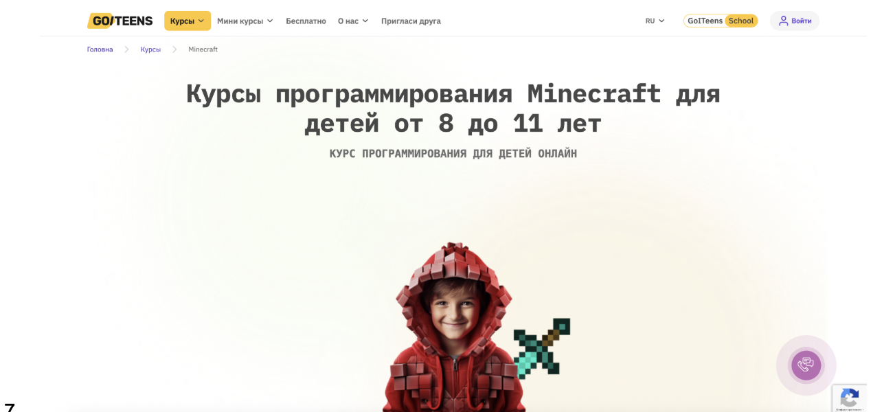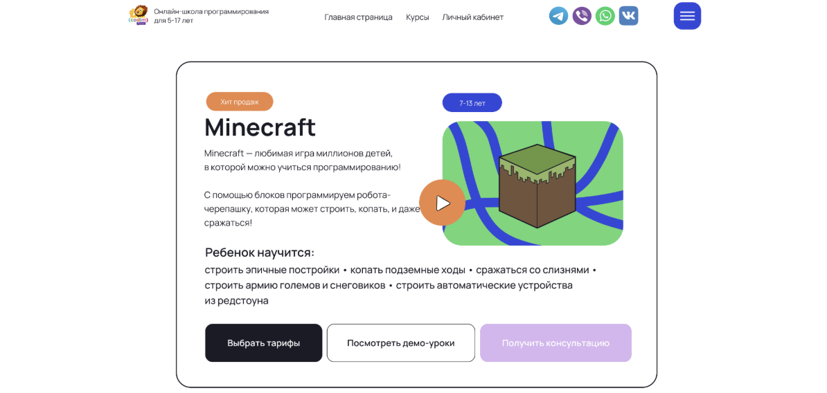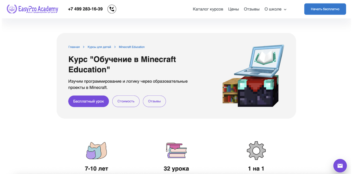 Кратко о курсе: Курс построен на обучении основам программирования через игровую среду Minecraft. Формат ориентирован на детей, которые только начинают знакомство с кодингом или испытывают трудности с информатикой в школе. Обучение проходит в игровой форме, без перегрузки теорией.